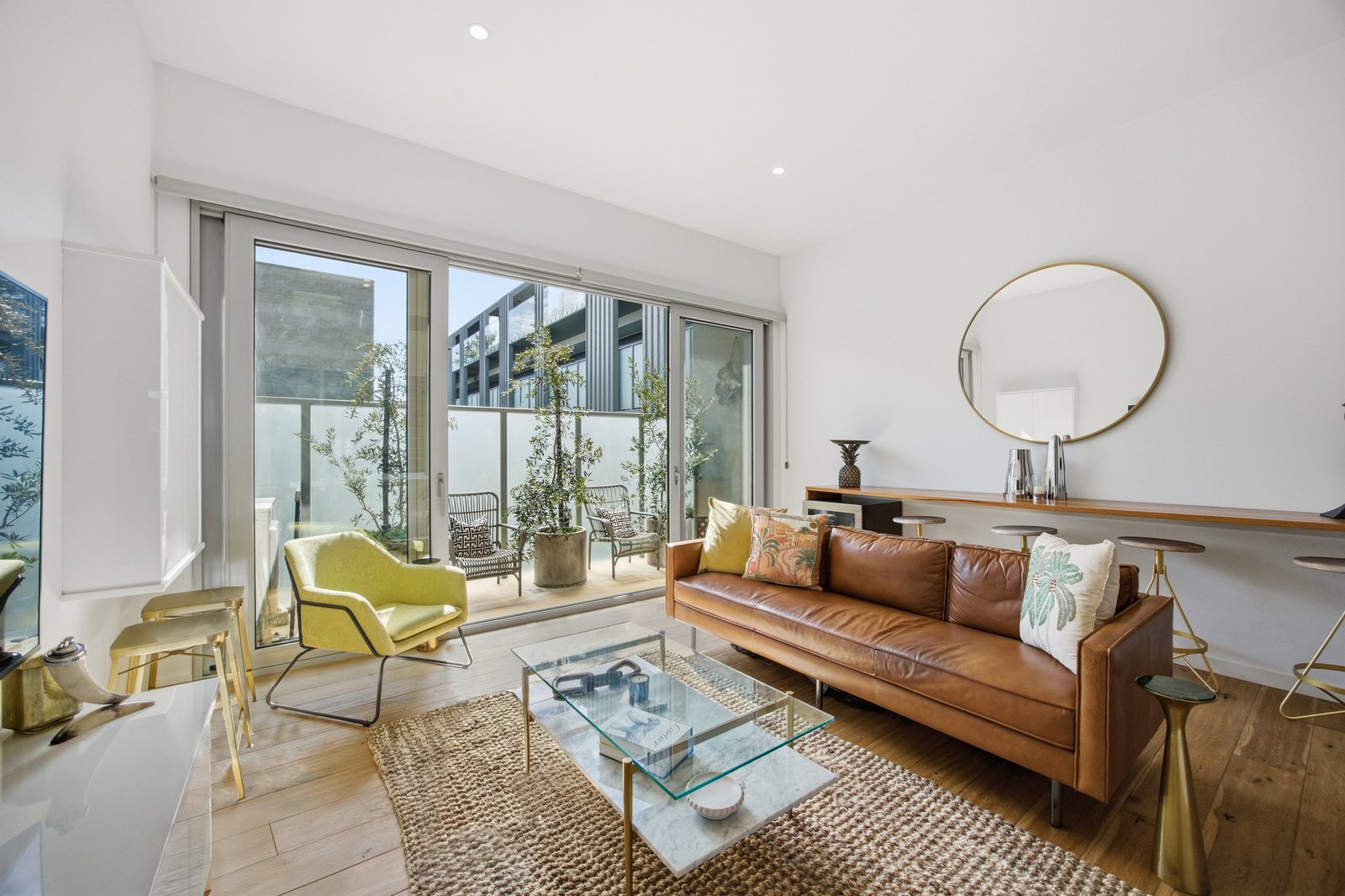 Wide engineered oak floors extend through a beautifully proportioned living domain where a wall of bespoke cabinetry forms a refined media and storage element, reinforcing the apartment’s clean architectural lines. Opposite, a fully integrated timber bar forms a natural place to gather within the living space.