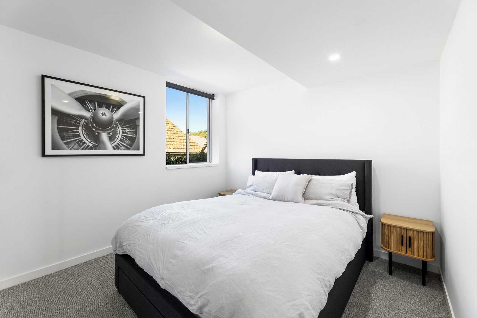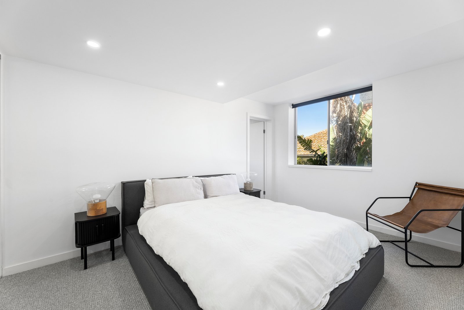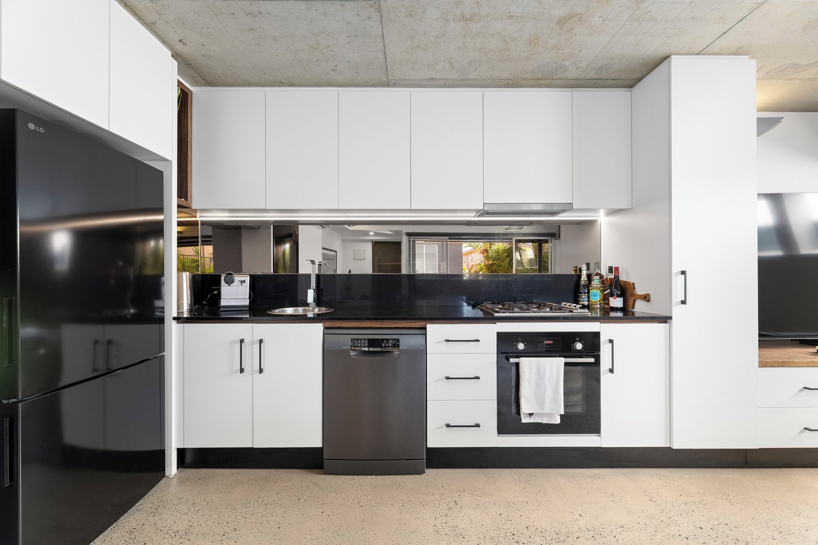 The light-filled open-plan living and dining area is enhanced by striking industrial-style concrete ceilings, creating a contemporary and inviting space. The sleek stone kitchen integrates seamlessly with the living zone and offers excellent storage and functionality.