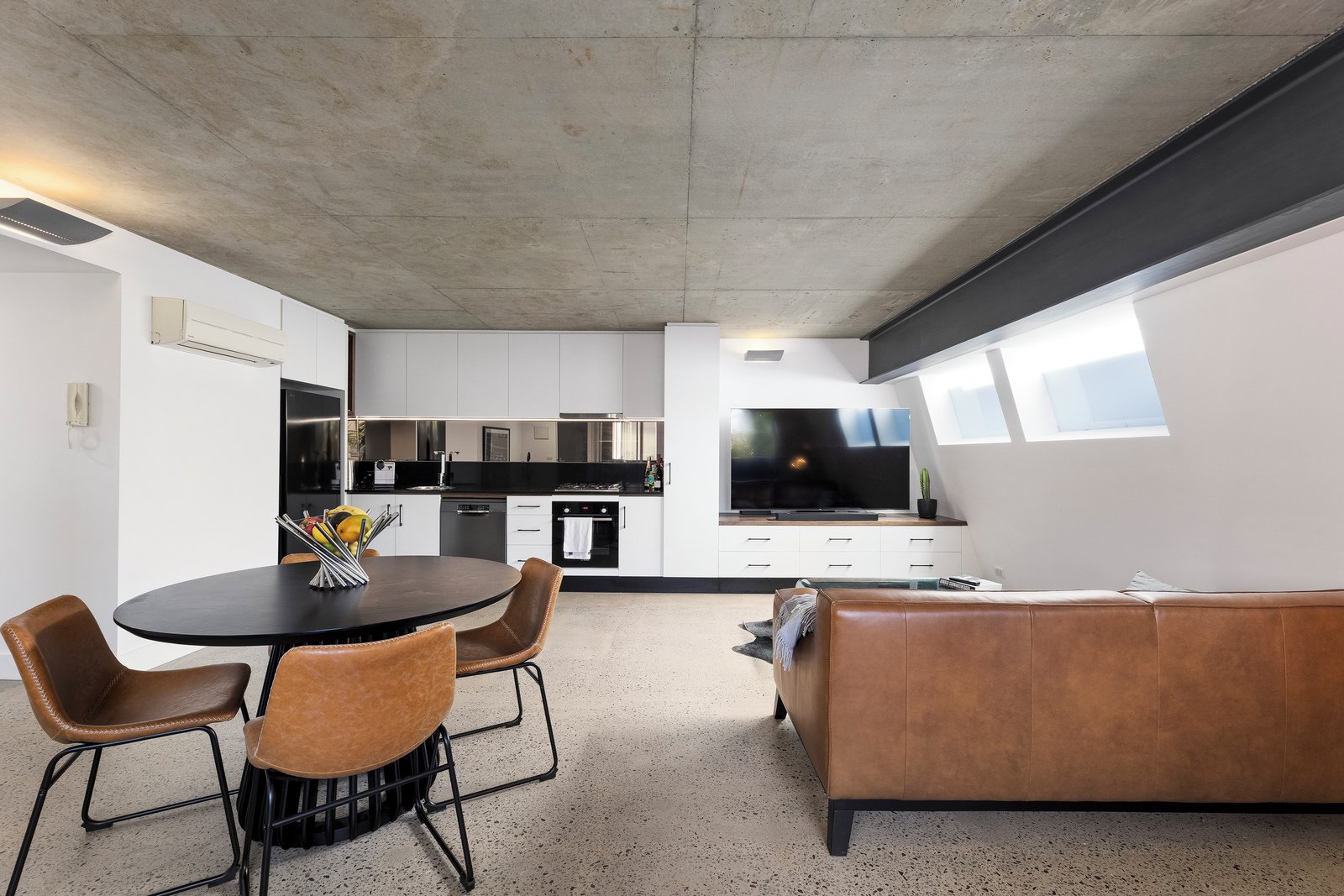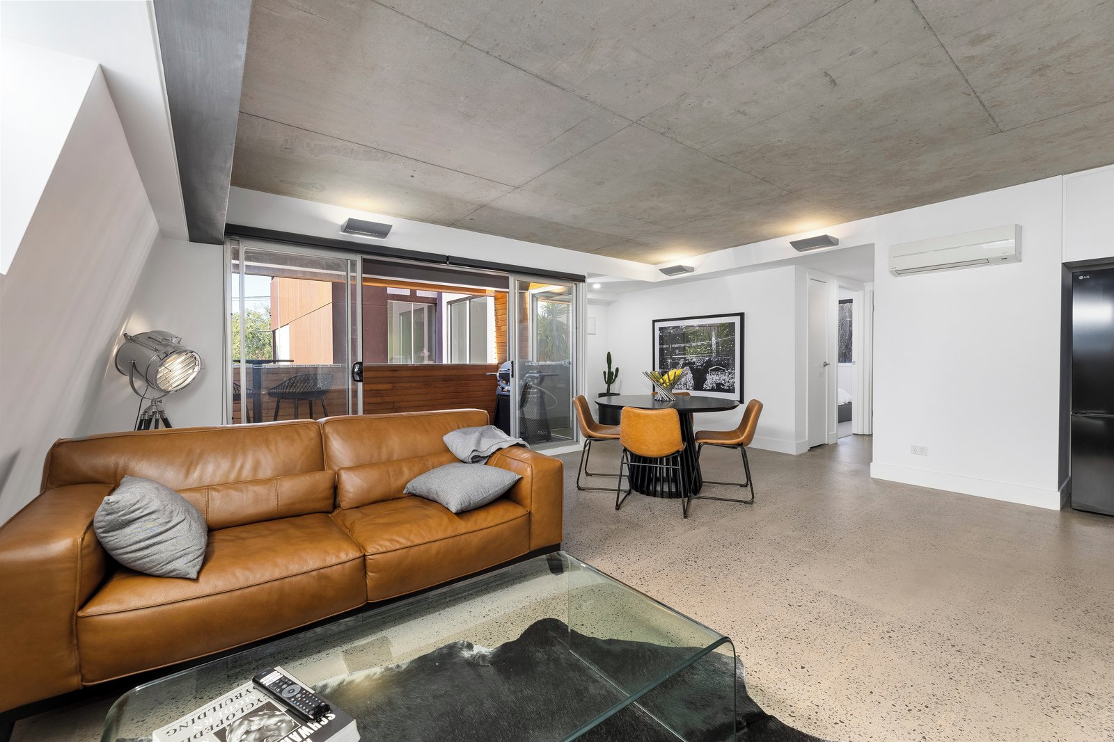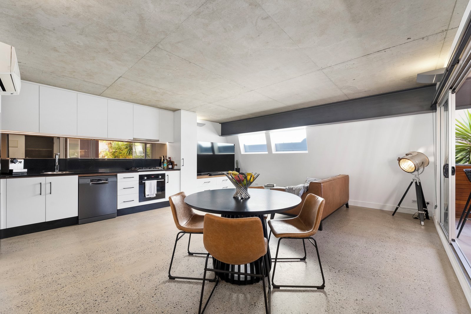 The light-filled open-plan living and dining area is enhanced by striking industrial-style concrete ceilings, creating a contemporary...