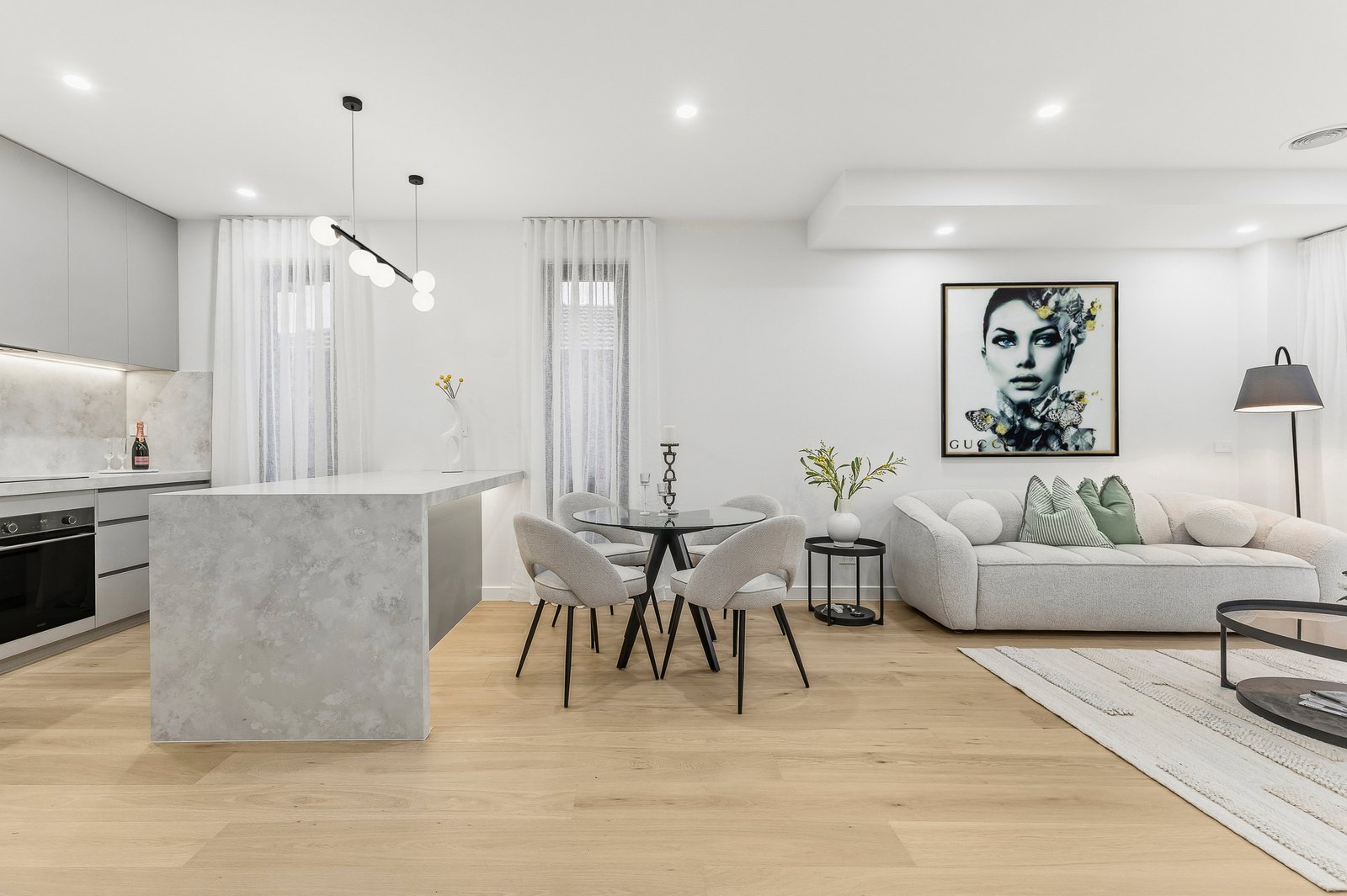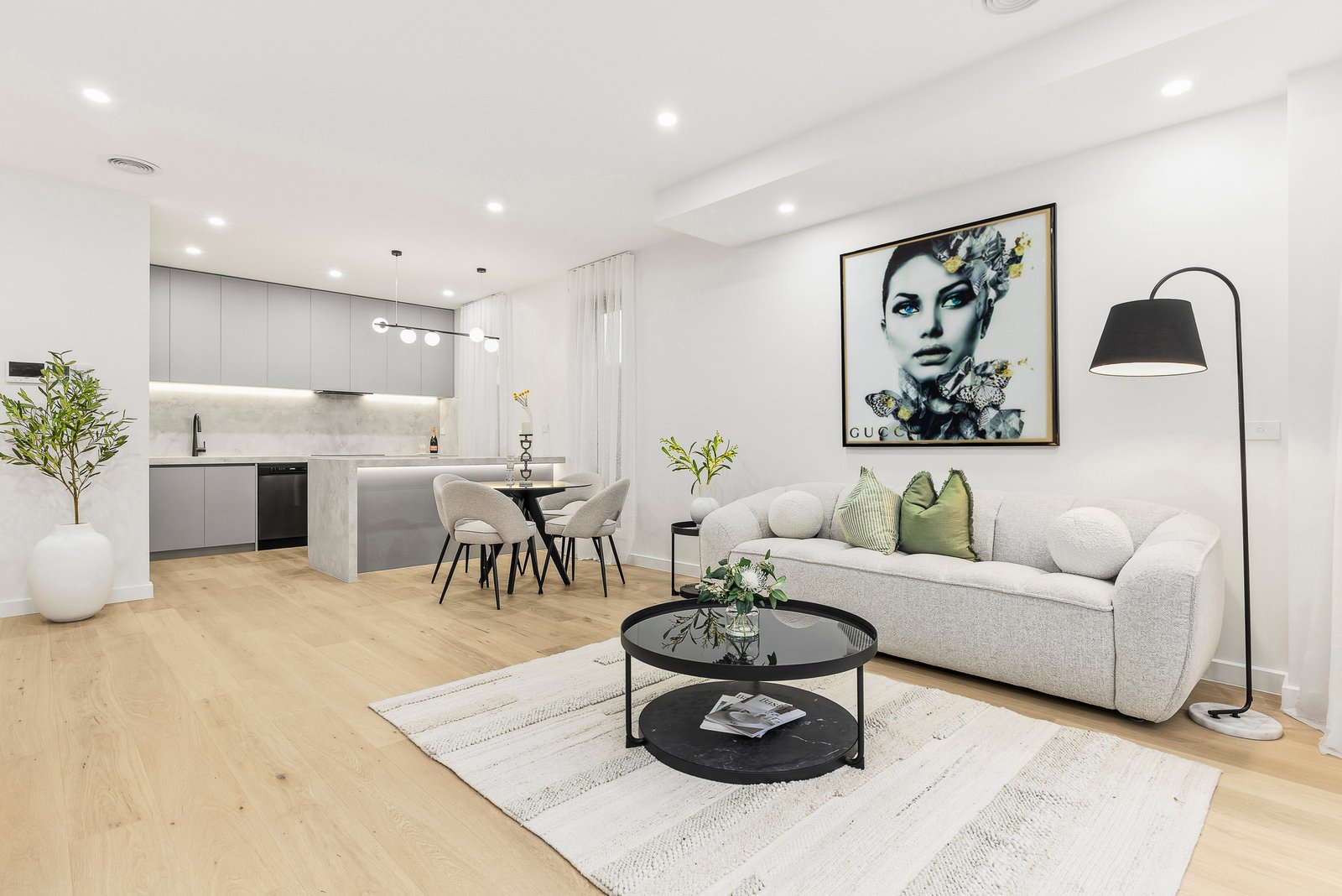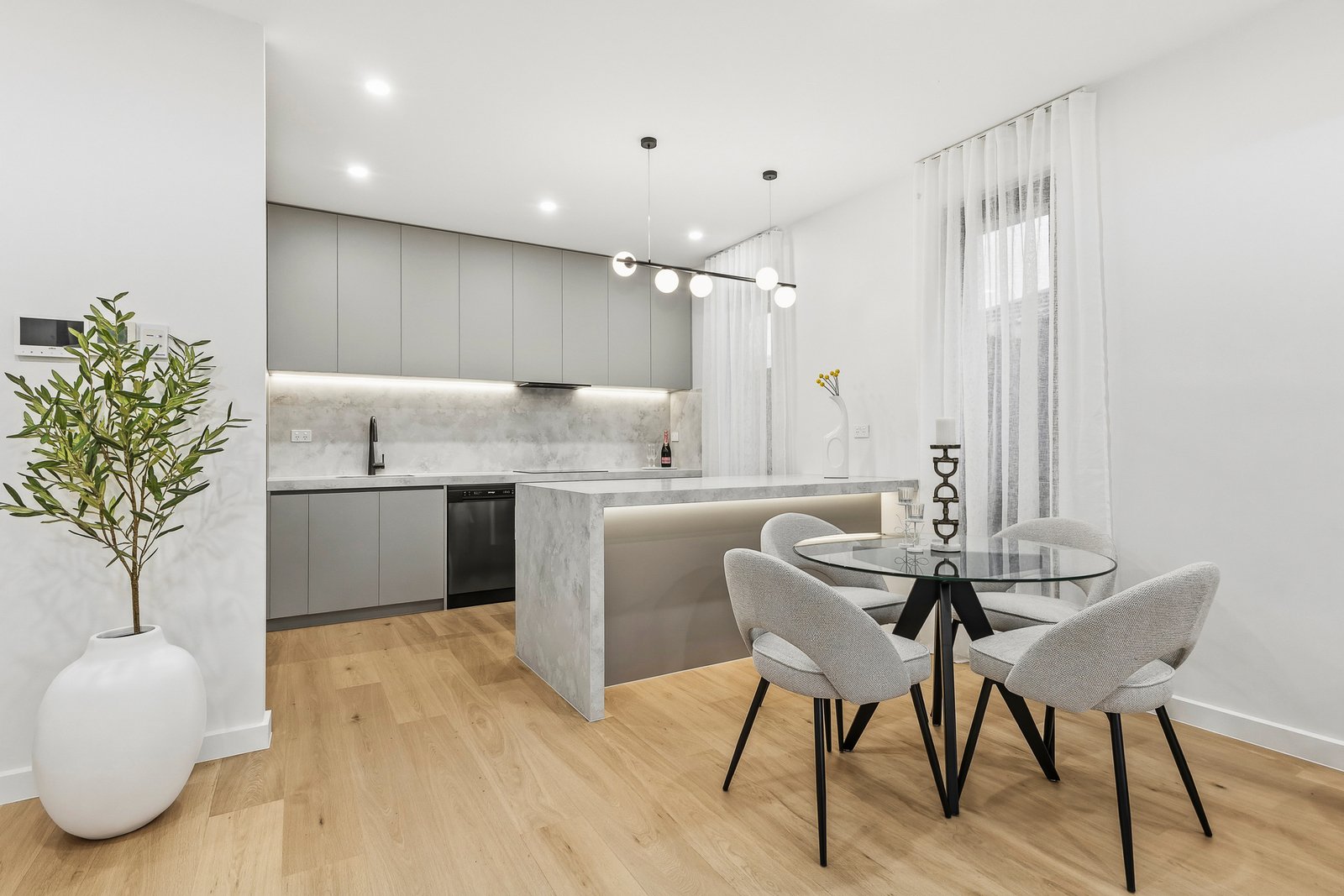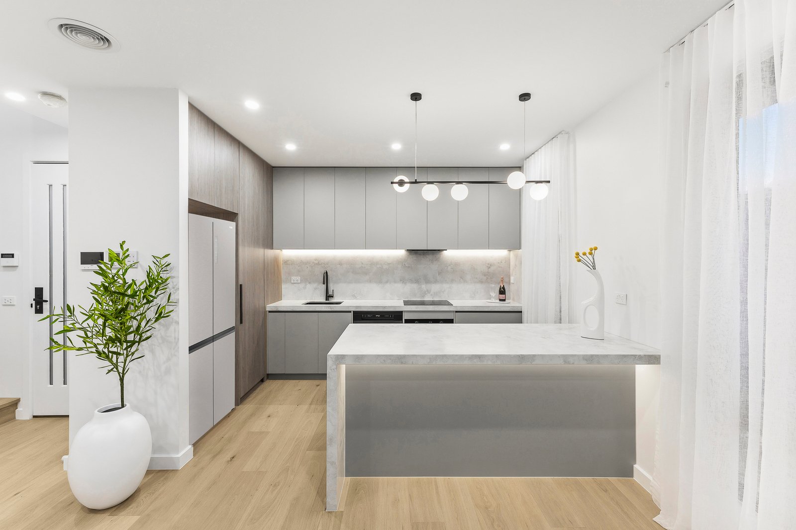 The designer kitchen is both stylish and functional, featuring Polytec matte anti-fingerprint cabinetry, premium appliances including an induction cooktop, air-fryer oven, and dishwasher, and sleek contemporary finishes that make everyday cooking and entertaining a pleasure.