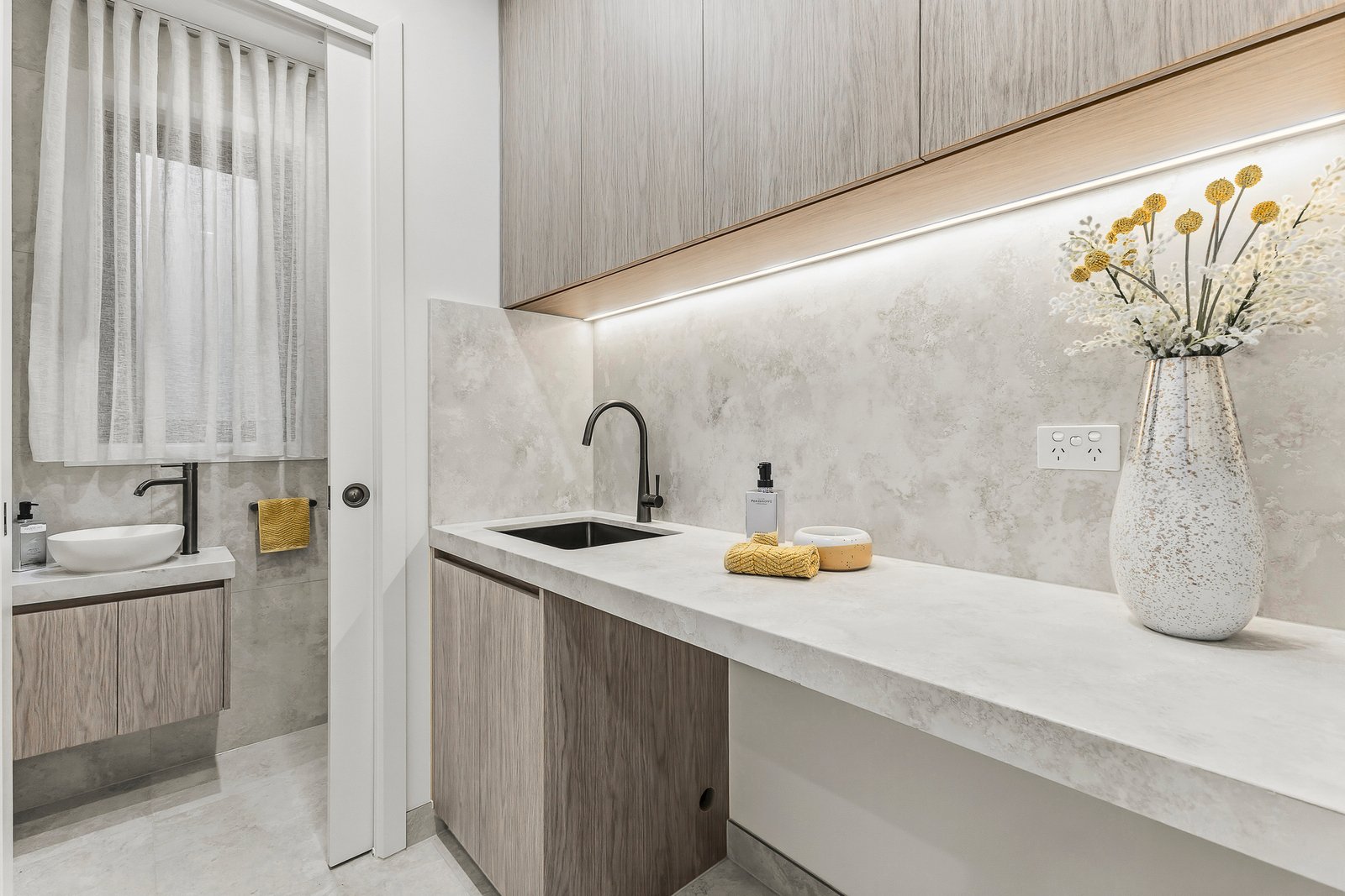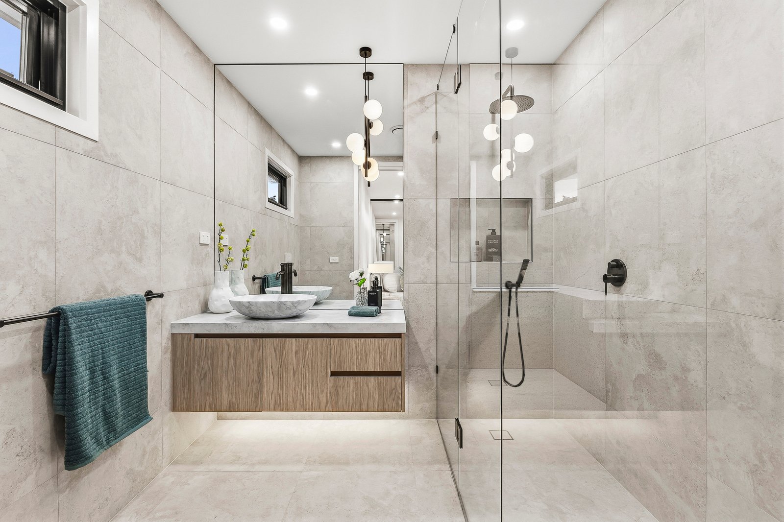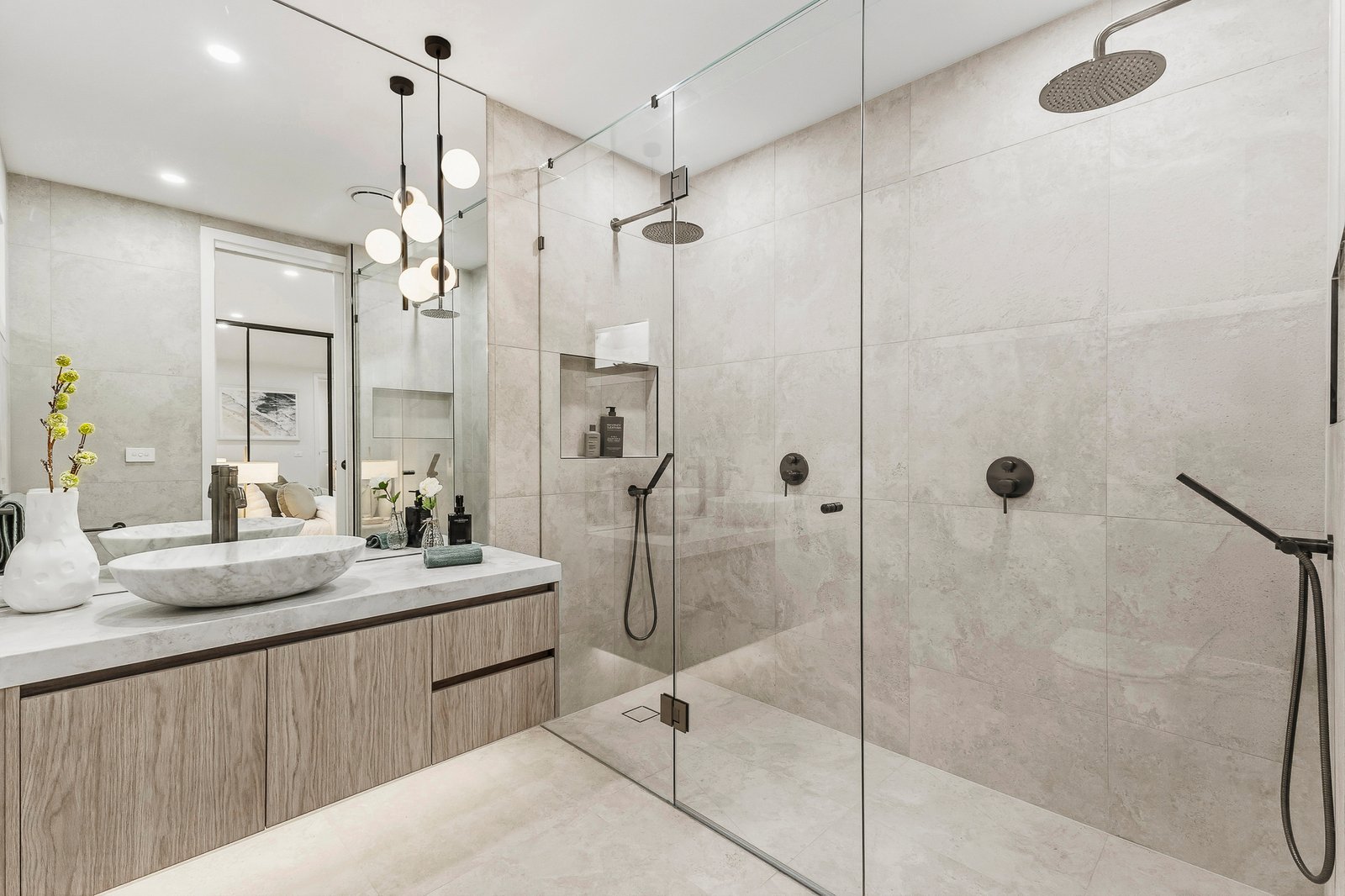 Both bathrooms feature luxury marble basins, designer tapware, and carefully curated ambient lighting, creating a refined and contemporary aesthetic.