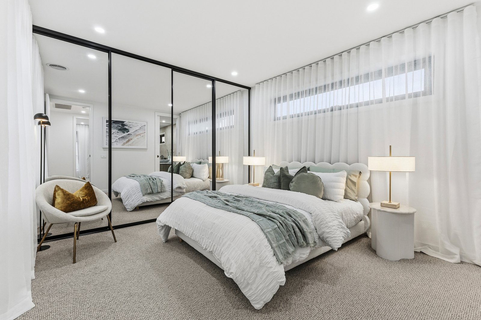 Inside, the bedrooms offer warmth and comfort with plush luxury loop carpets, while the living spaces are highlighted by Kustom Timber designer engineered hardwood flooring. A striking custom matching staircase adds architectural character and craftsmanship, enhancing the home’s sophisticated design.
