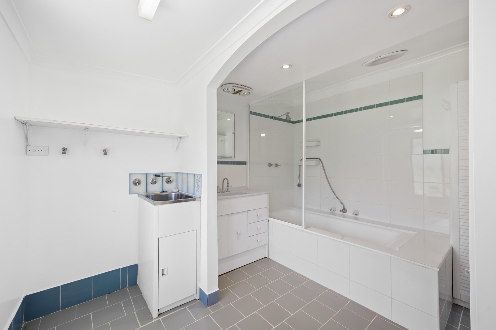 - Bathroom with shower over bath and vanity
