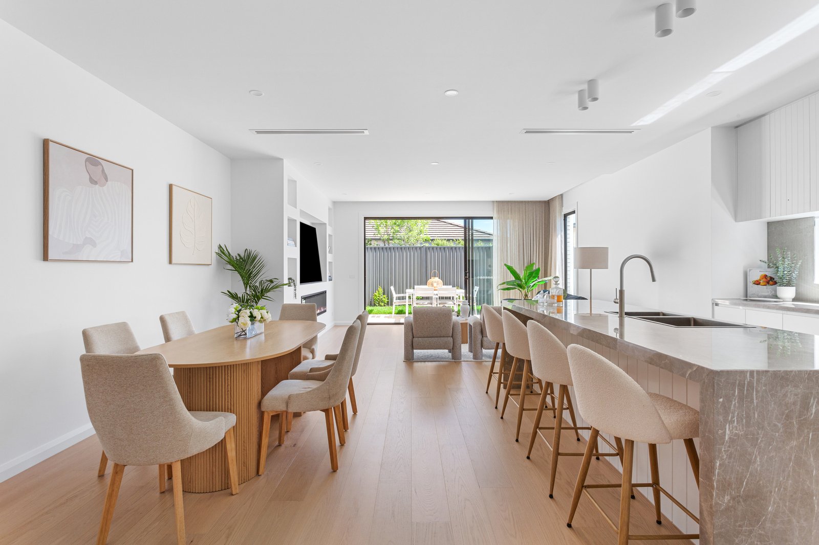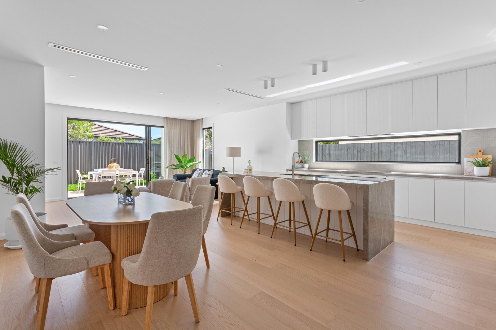 Drawing admiration with its striking tundra grey marble, pristine white brick facade, and impressive 2700mm ceilings that elevate the living experience across both light-filled levels, the home prioritises an open-concept ground floor where the opulence of hardwood timber floors meets the brilliance of generous double glazing. Broad stackable doors reveal a completely private outdoor retreat, while the true chef’s kitchen sits well-appointed with a full line-up of Bosch appliances, walk-in pantry with custom cabinetry, and 40mm tundra grey marble benchtops.