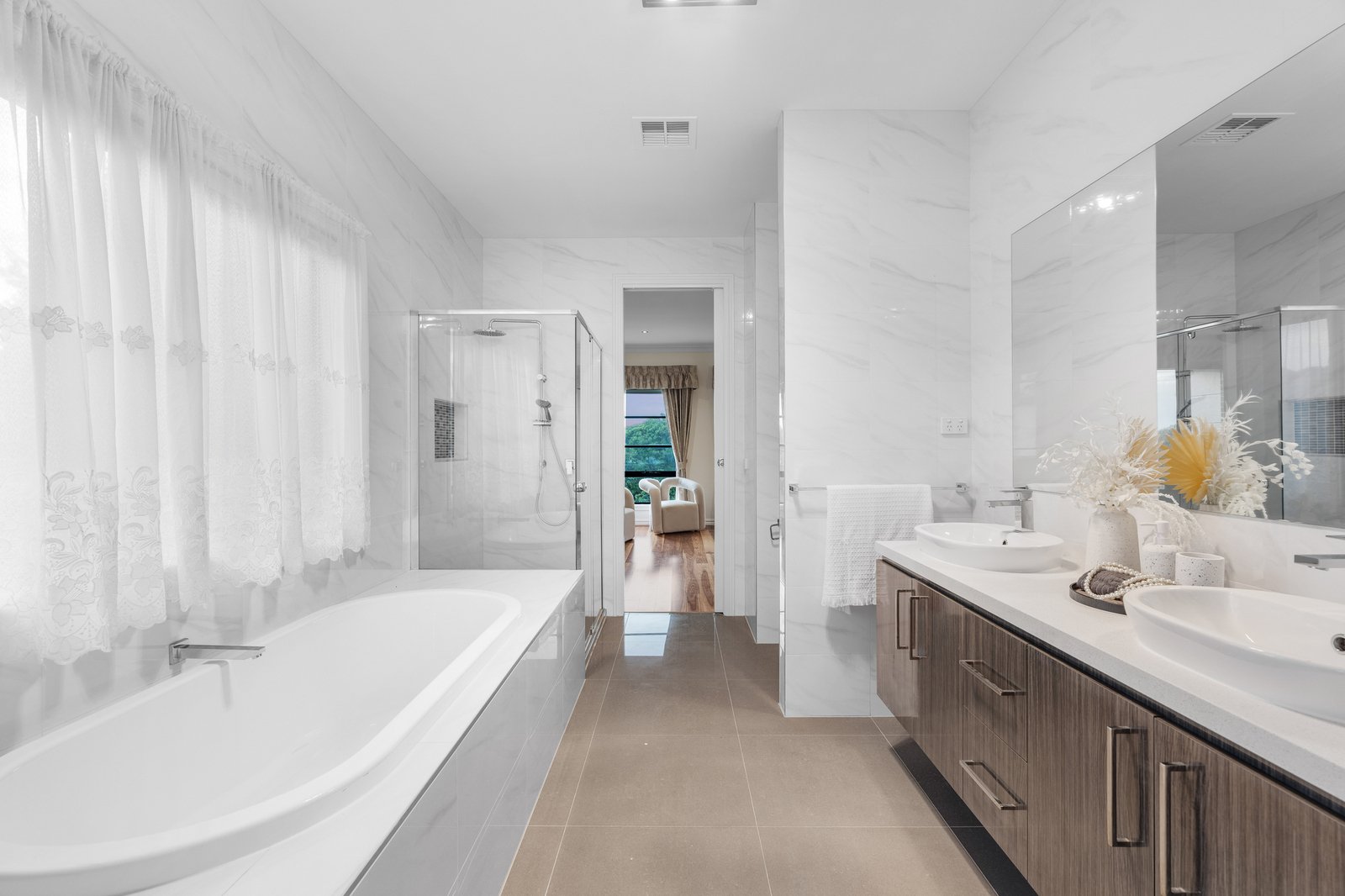 The thoughtfully designed layout comprises six generously sized bedrooms, each appointed with its own private ensuite, making it perfectly suited to large or multi-generational families. Downstairs, a formal lounge featuring a statement fireplace is complemented by an expansive open-plan living and dining domain, enhanced by elegant timber flooring and seamless connection to the outdoors. The gourmet kitchen forms the heart of the home, showcasing stone benchtops, premium stainless steel appliances, and a second kitchen, ideal for both everyday living and entertaining at scale.
