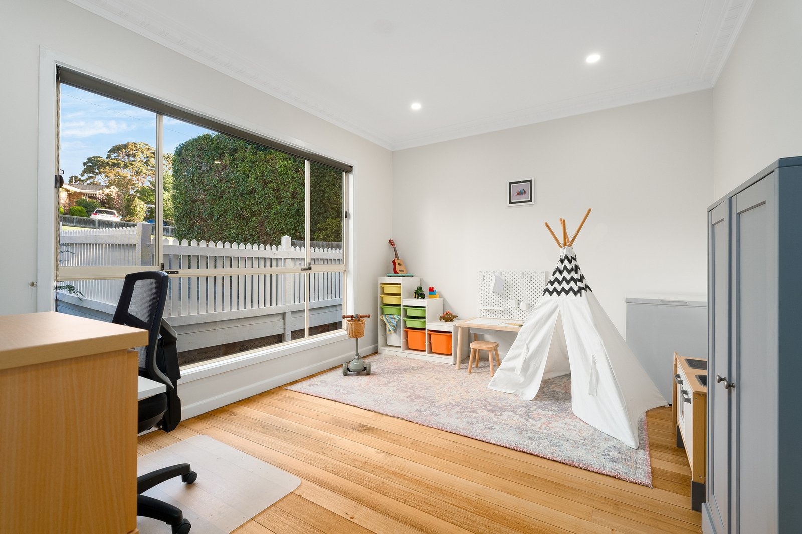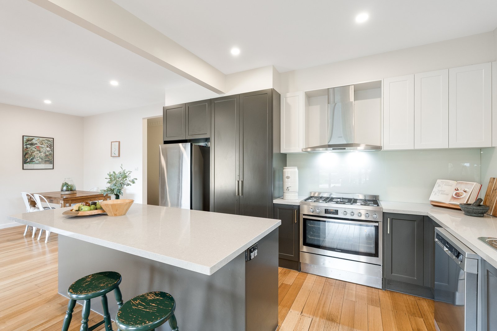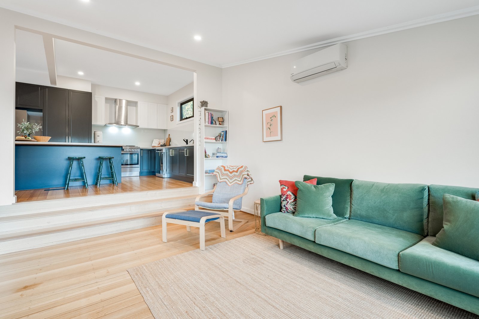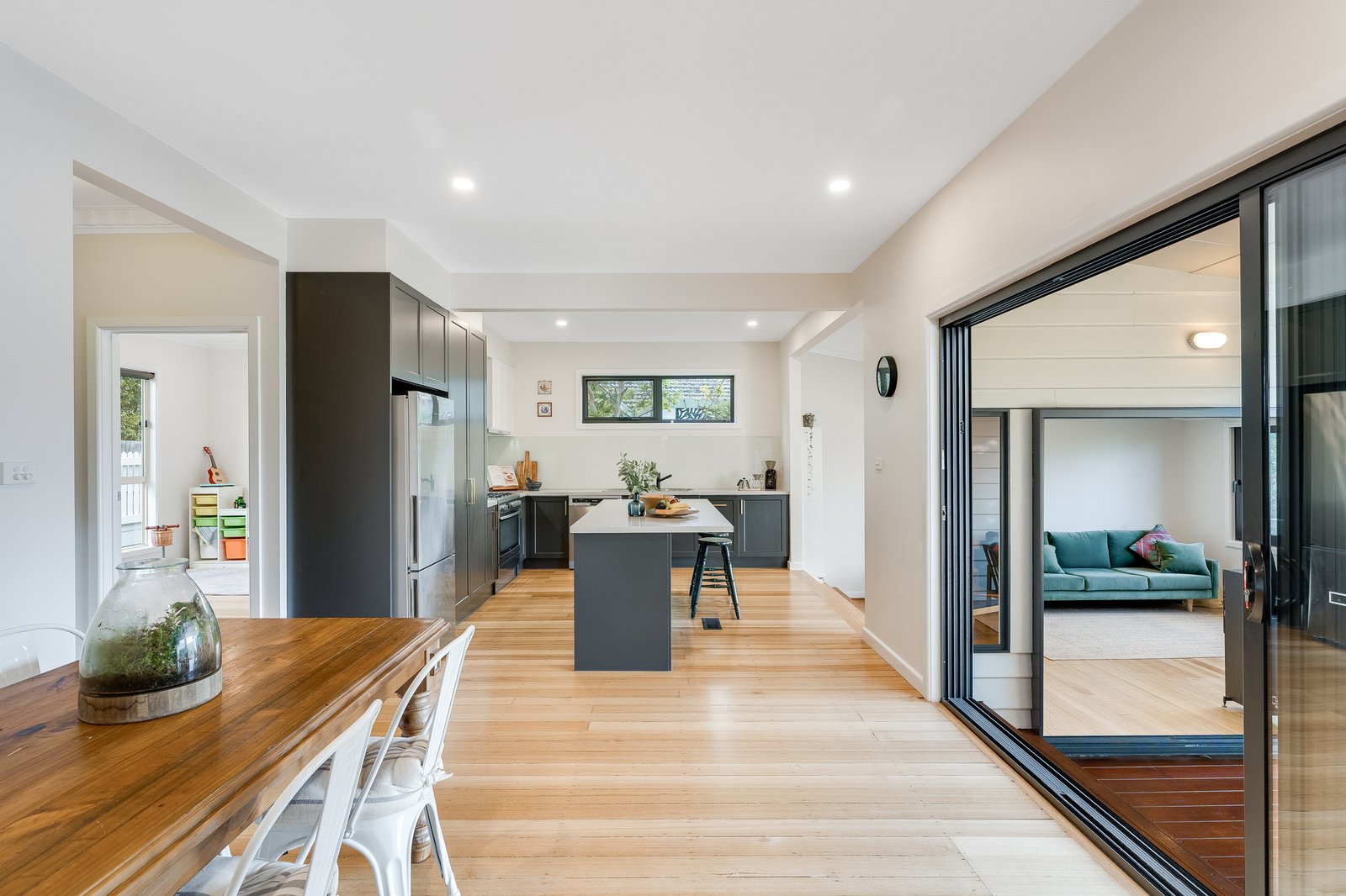 Inside, the home reveals four well-proportioned bedrooms and two bathrooms, with a stunning renovated kitchen forming the heart of the home. Designed for both practicality and connection, the kitchen overlooks a light-filled open plan dining and living area, creating the perfect hub for everyday family life and entertaining. Large windows flood the space with natural light while enhancing the sense of openness throughout.