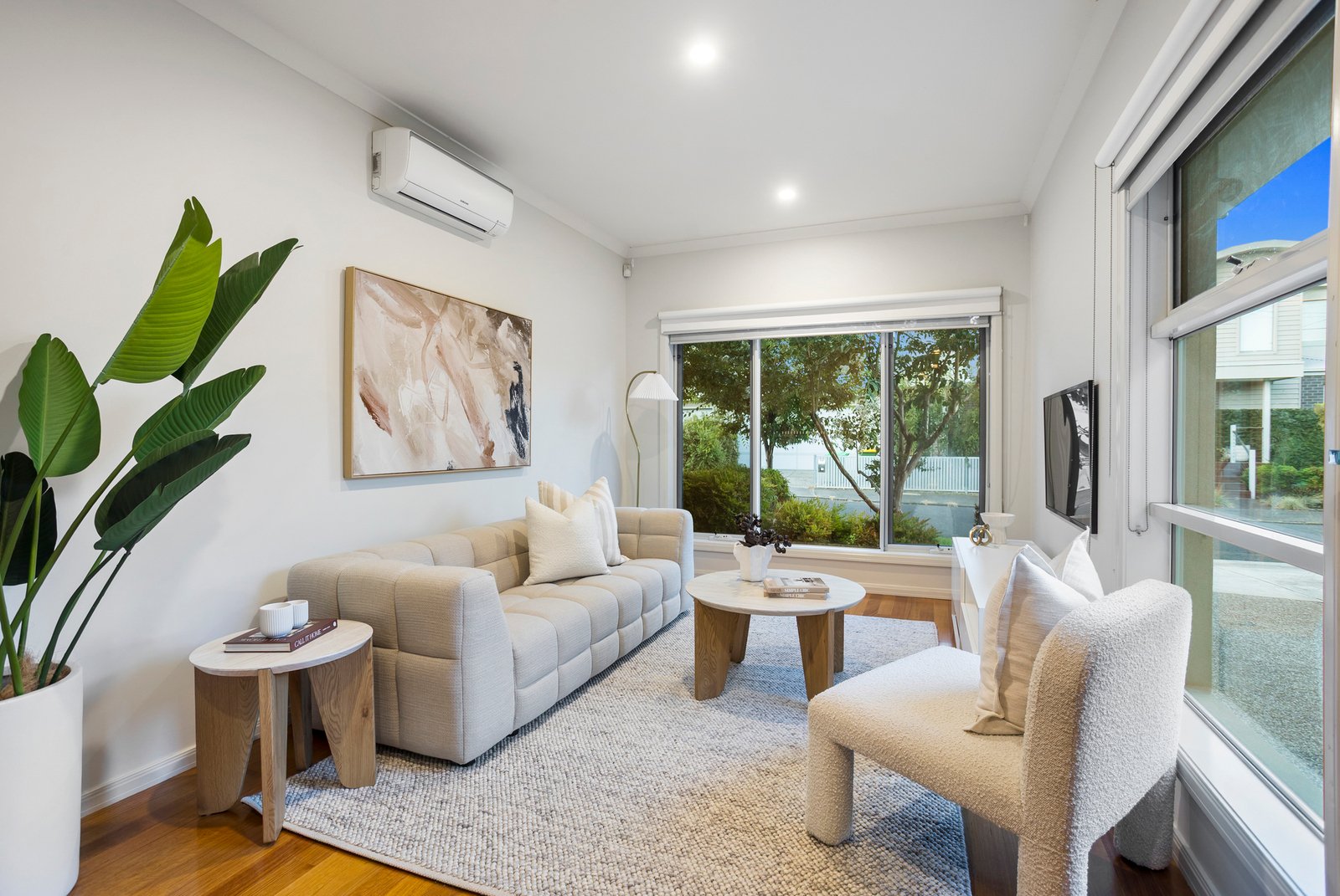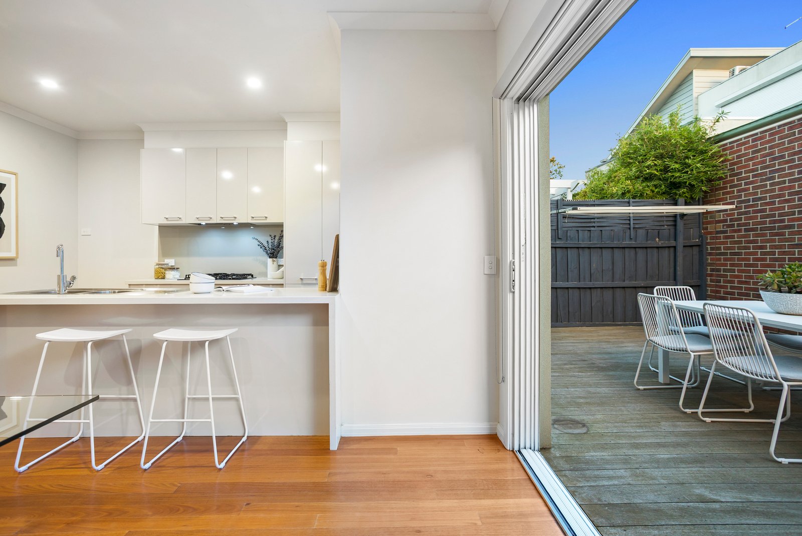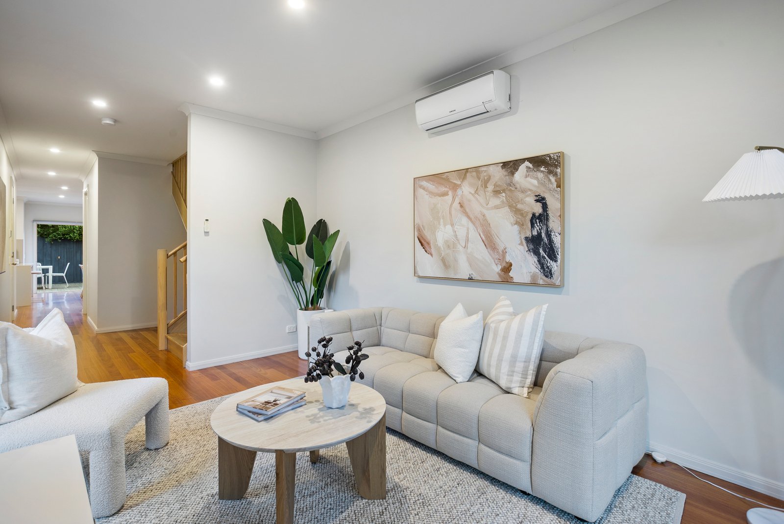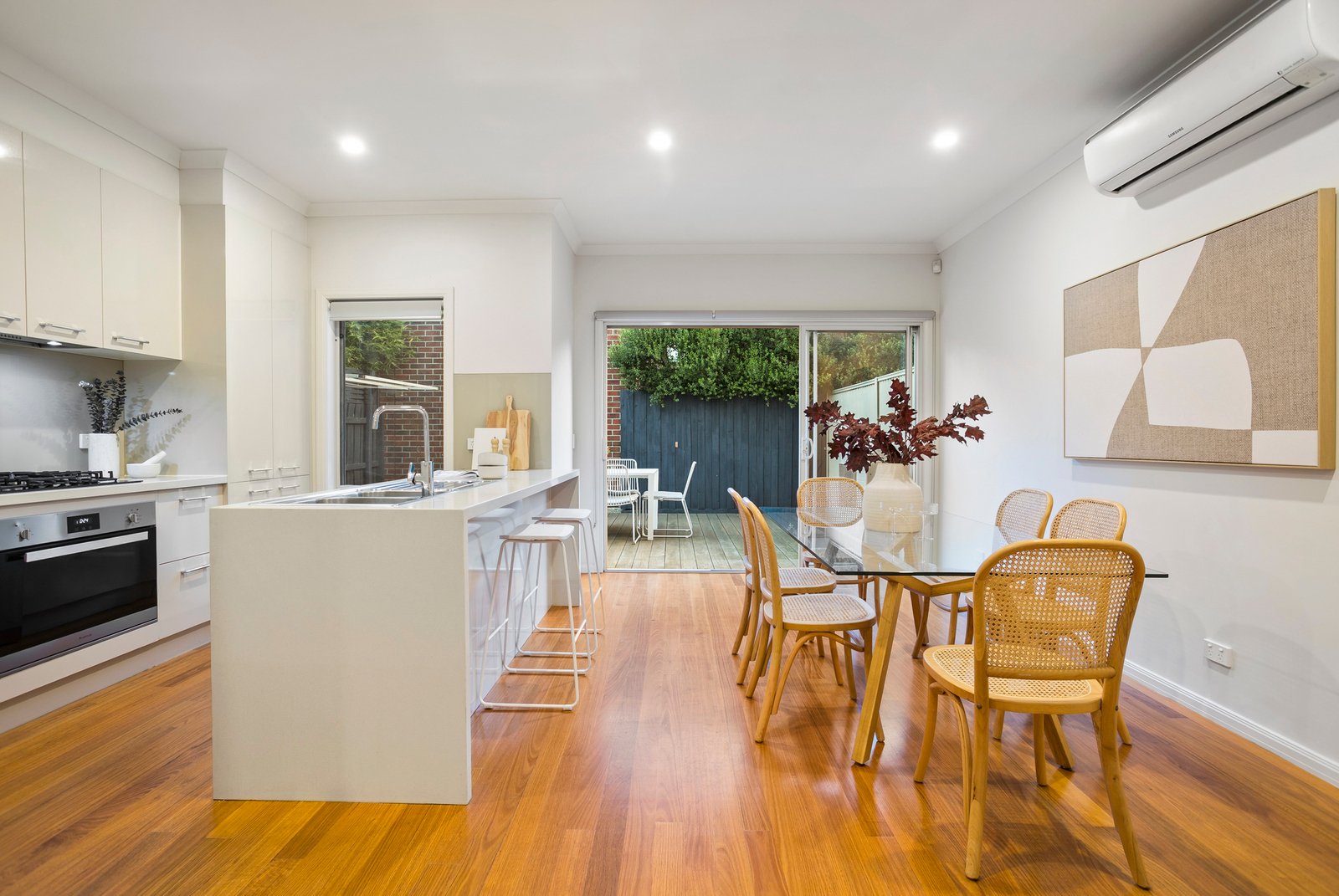 Three spacious bedrooms each come complete with built-in robes, while the master bedroom enjoys the luxury of a private en suite. Solid Blackbutt hardwood floorboards run underfoot, and split-system air conditioning in every room ensures effortless comfort whatever the season brings.