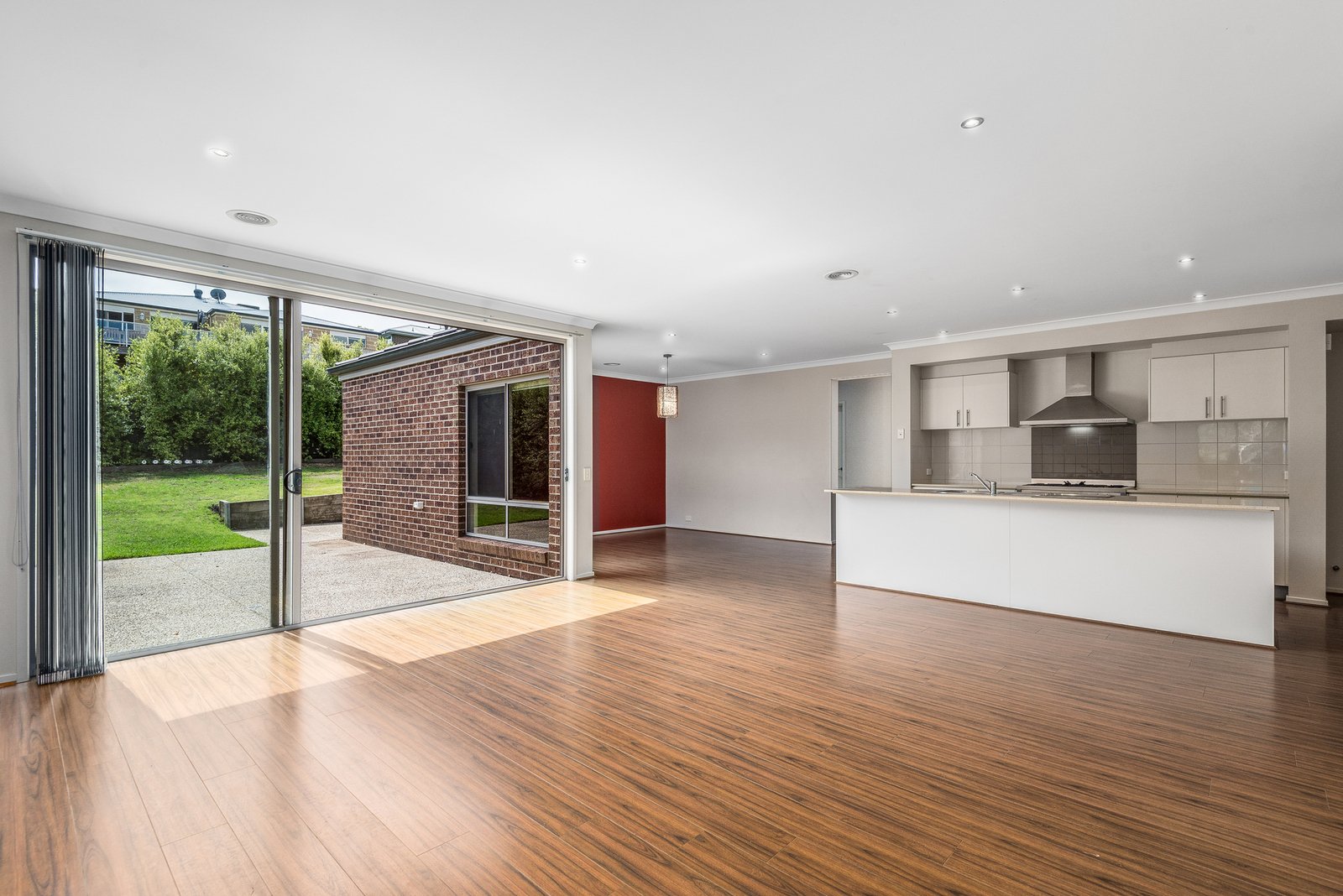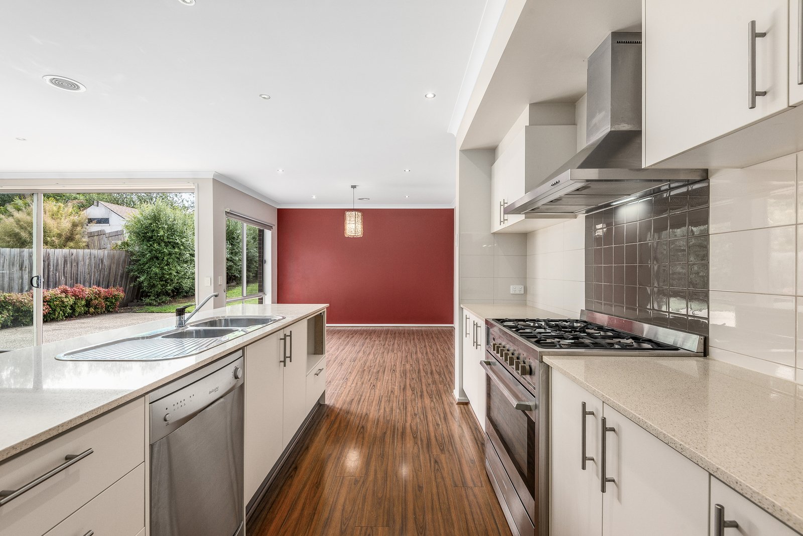 Perched on an elevated allotment, arrival at the home introduces scenic views of the leafy surrounds. On entry, a formal lounge greets you within, offering a quiet space to retreat with a picturesque vista. The rear of the home transitions to a spacious open plan kitchen dining and living area designed for seamless-indoor-outdoor living and entertaining. The well-appointed kitchen features stone benchtops, a 900mm oven and cooktop, rangehood, dishwasher, ample bench space and generous storage including a large walk-in pantry.