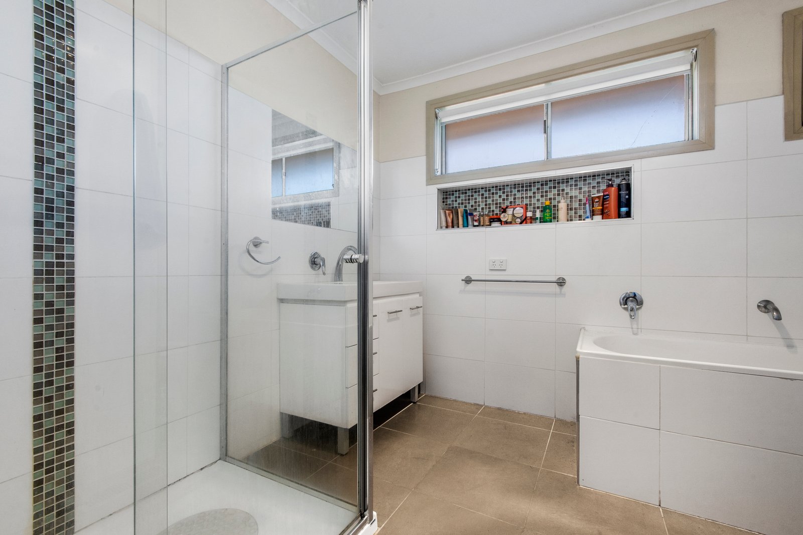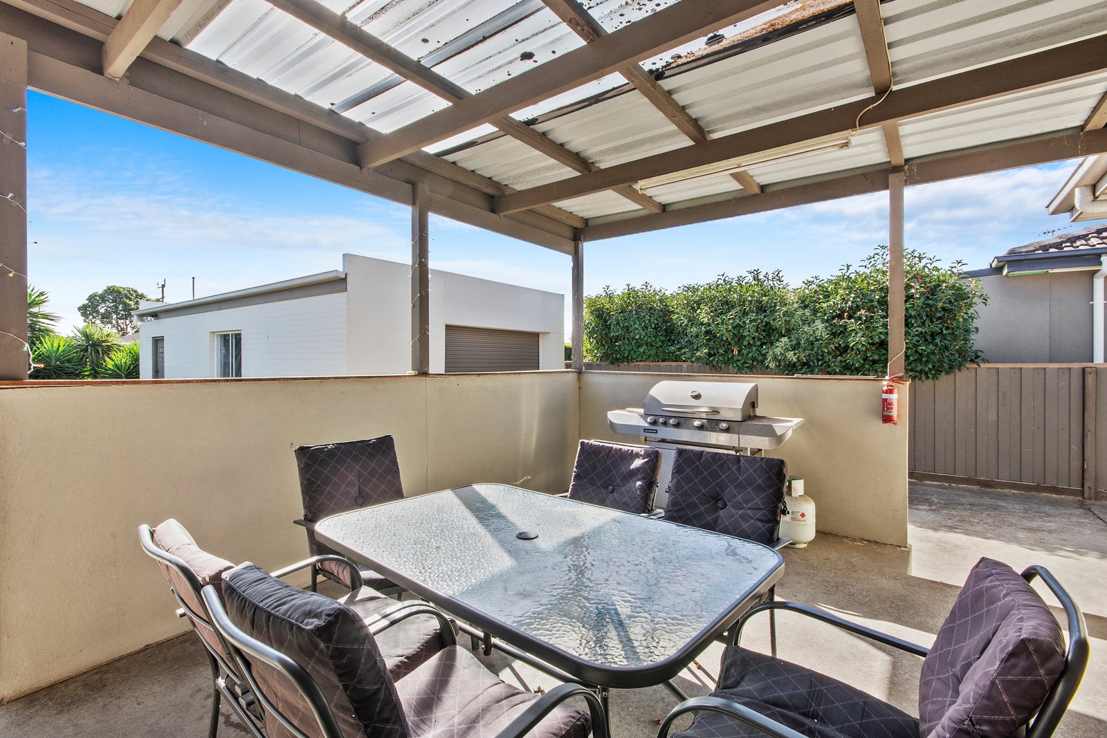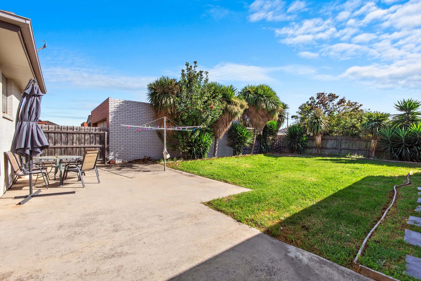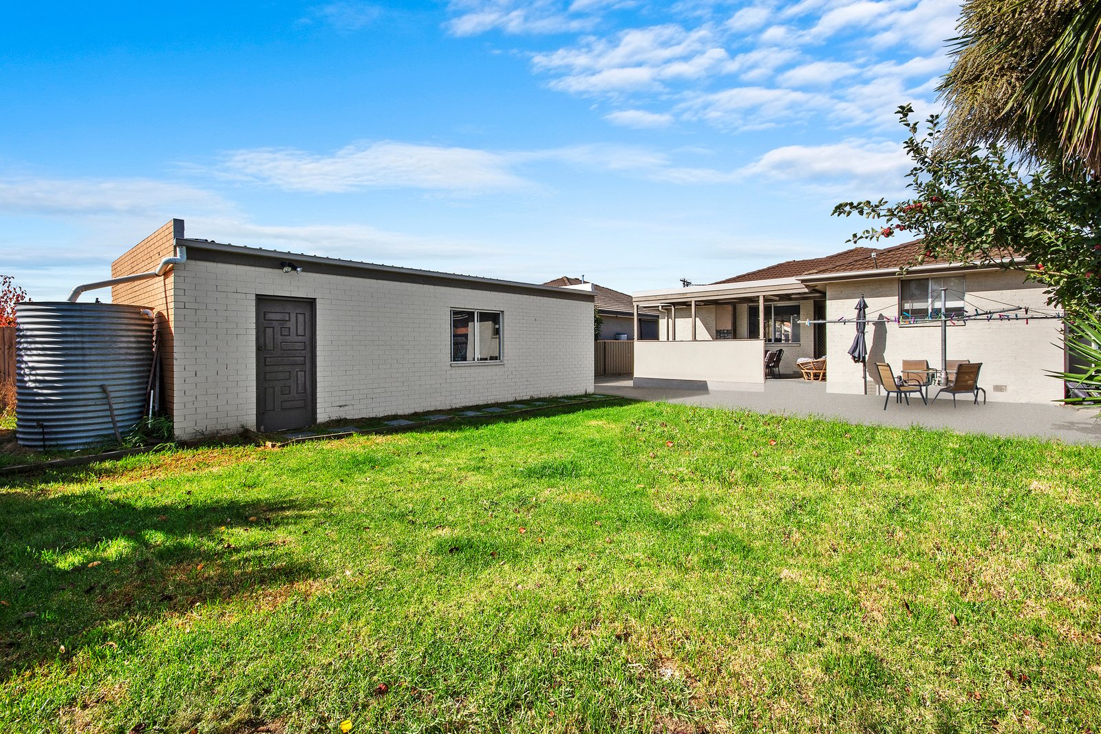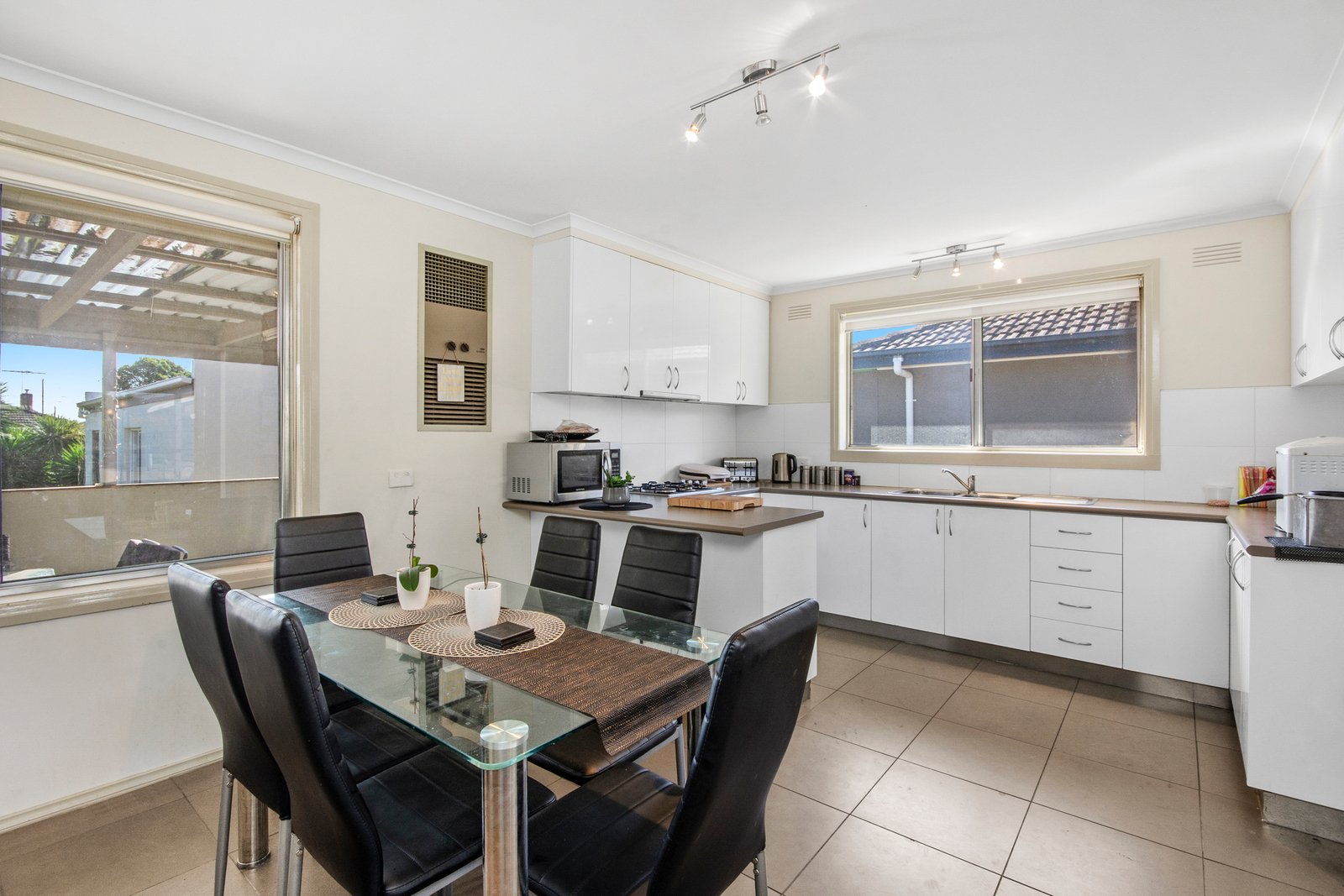 Accommodation includes three spacious bedrooms, all with built-in robes. The central family bathroom offers a separate shower, bathtub and generous vanity storage. Comfort is ensured year-round with gas central heating and a wall-mounted air conditioner.