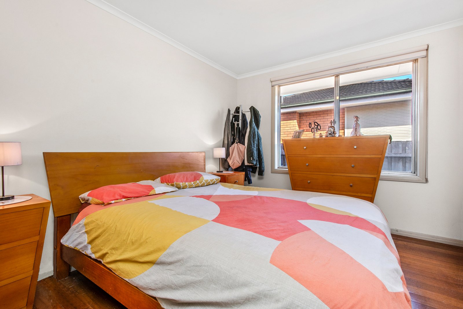 Inside, the home welcomes you into a central living space where the modern kitchen is both practical and stylish, featuring a gas cooktop, electric oven and ample cupboard storage. The kitchen flows seamlessly into the dining area and light-filled living room, which enjoys a pleasant outlook over the front garden.
