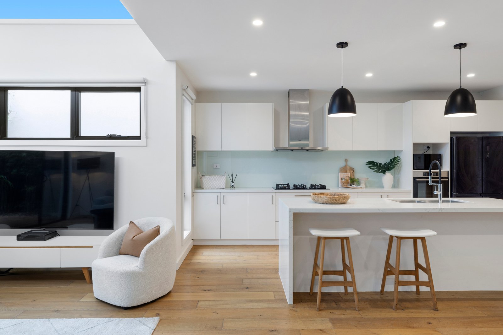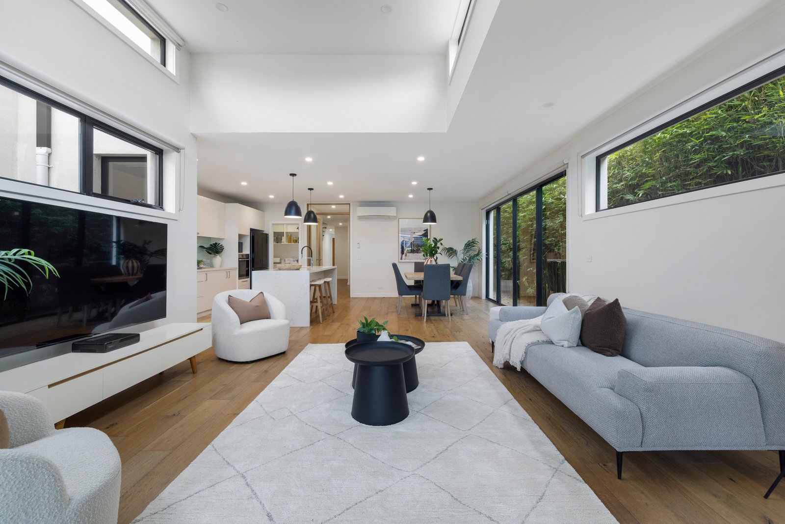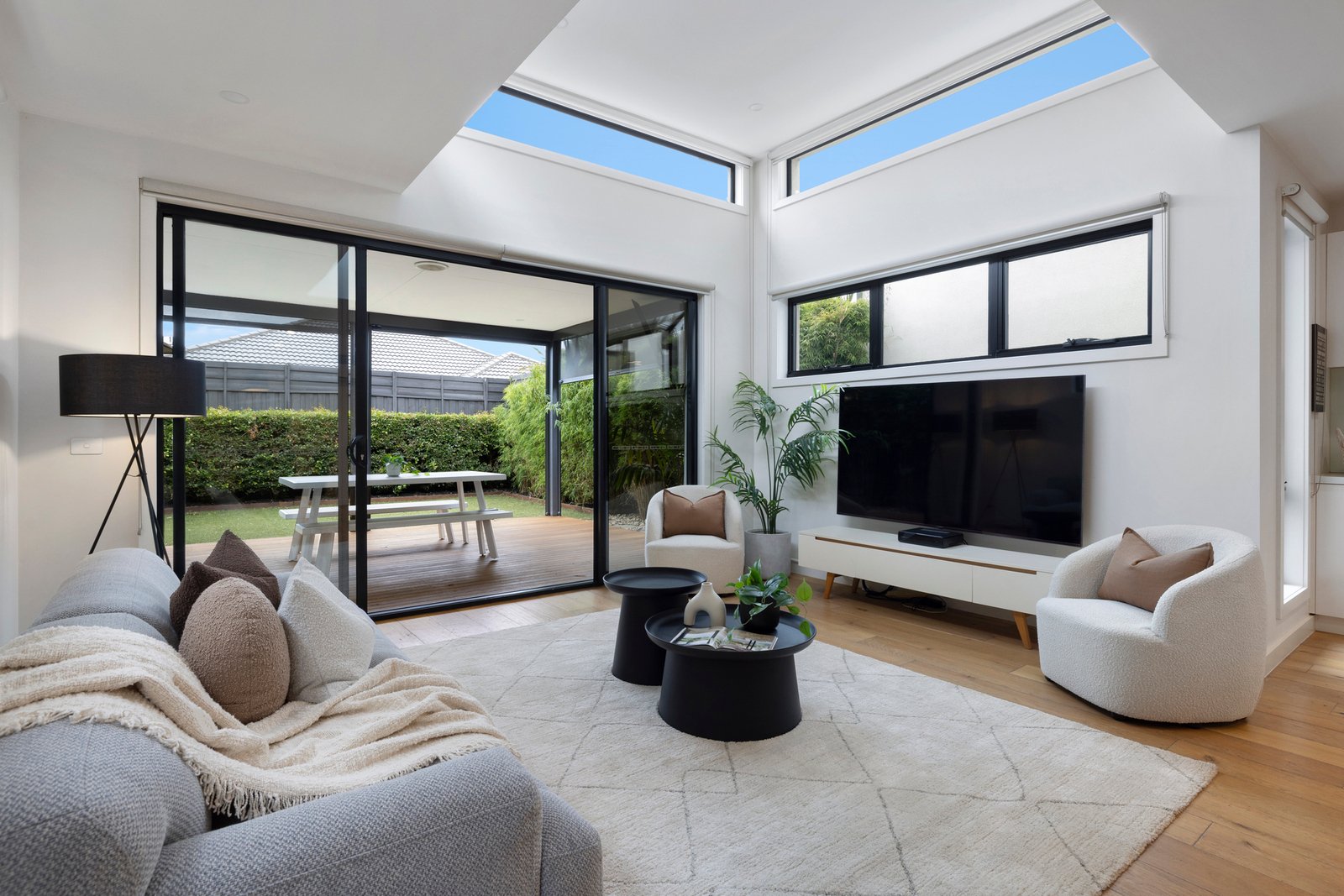 At the heart of the home, the gourmet Bosch-appointed kitchen with butler’s pantry and waterfall island overlooks the open plan living and dining zone. A striking raised ceiling with clerestory windows floods the space with natural light, while two sets of sliding doors seamlessly connect indoors to a sun-drenched spotted gum deck and a private courtyard complete with low-maintenance artificial turf – ideal for relaxed entertaining or easy family living.