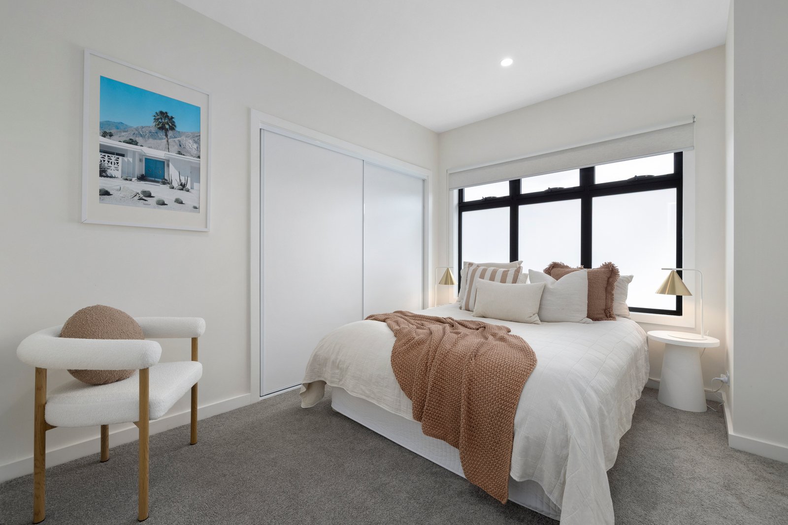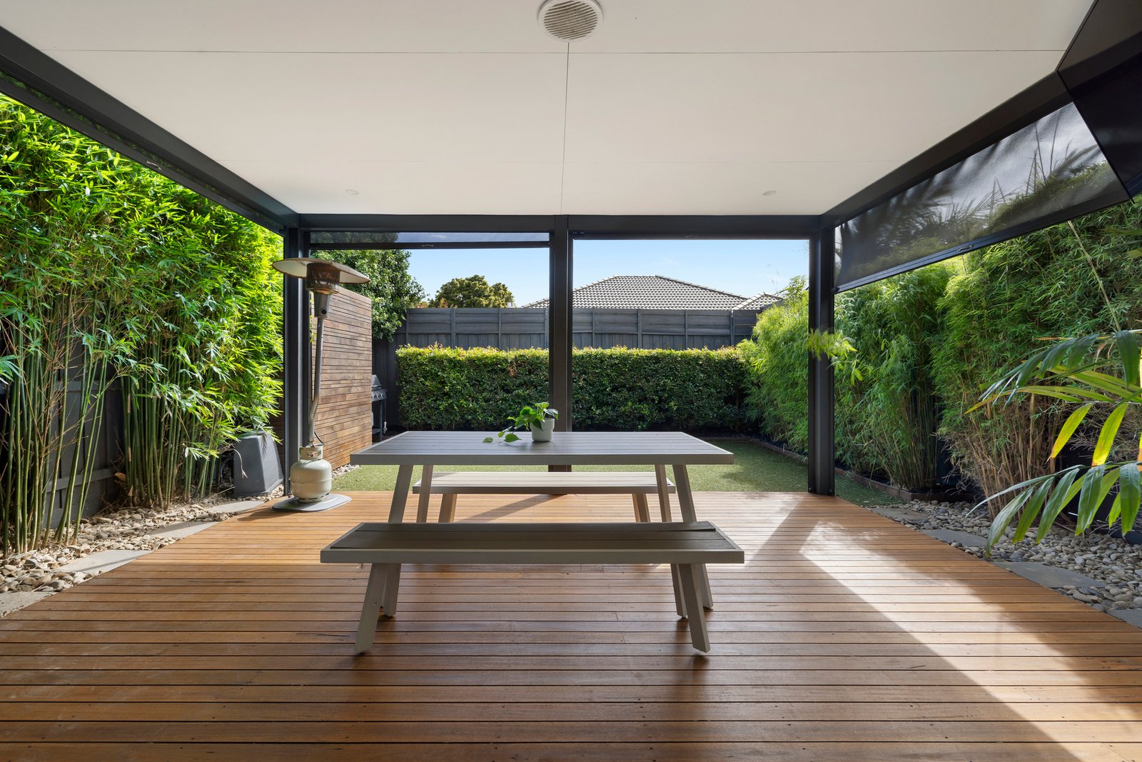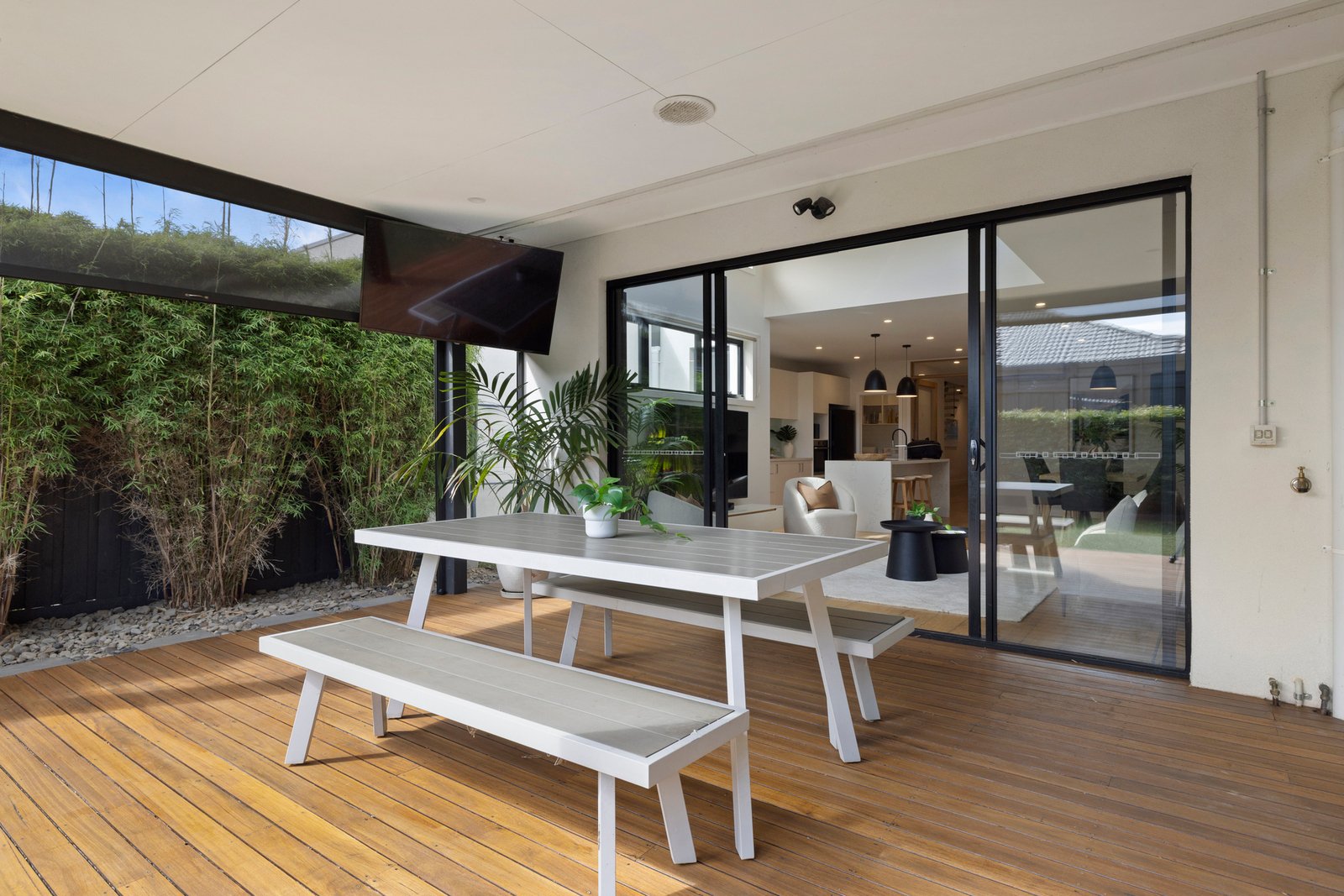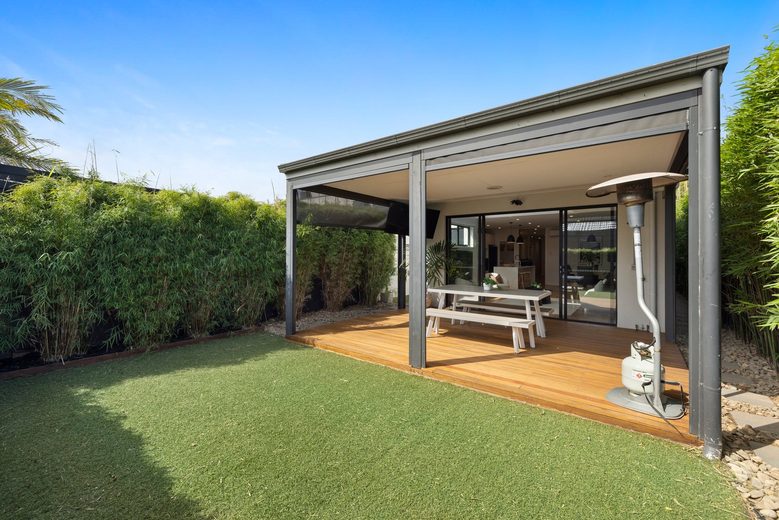 At the heart of the home, the gourmet Bosch-appointed kitchen with butler’s pantry and waterfall island overlooks the open plan living and dining zone. A striking raised ceiling with clerestory windows floods the space with natural light, while two sets of sliding doors seamlessly connect indoors to a sun-drenched spotted gum deck and a private courtyard complete with low-maintenance artificial turf – ideal for relaxed entertaining or easy family living.