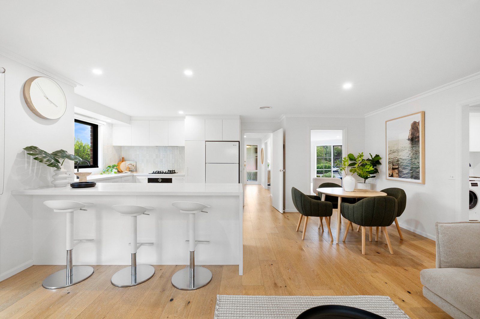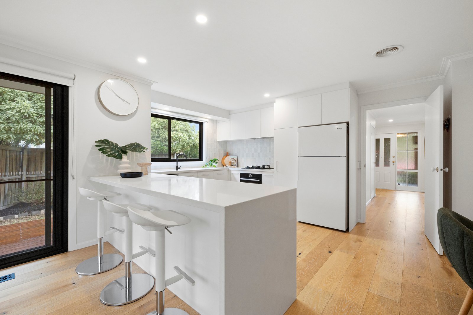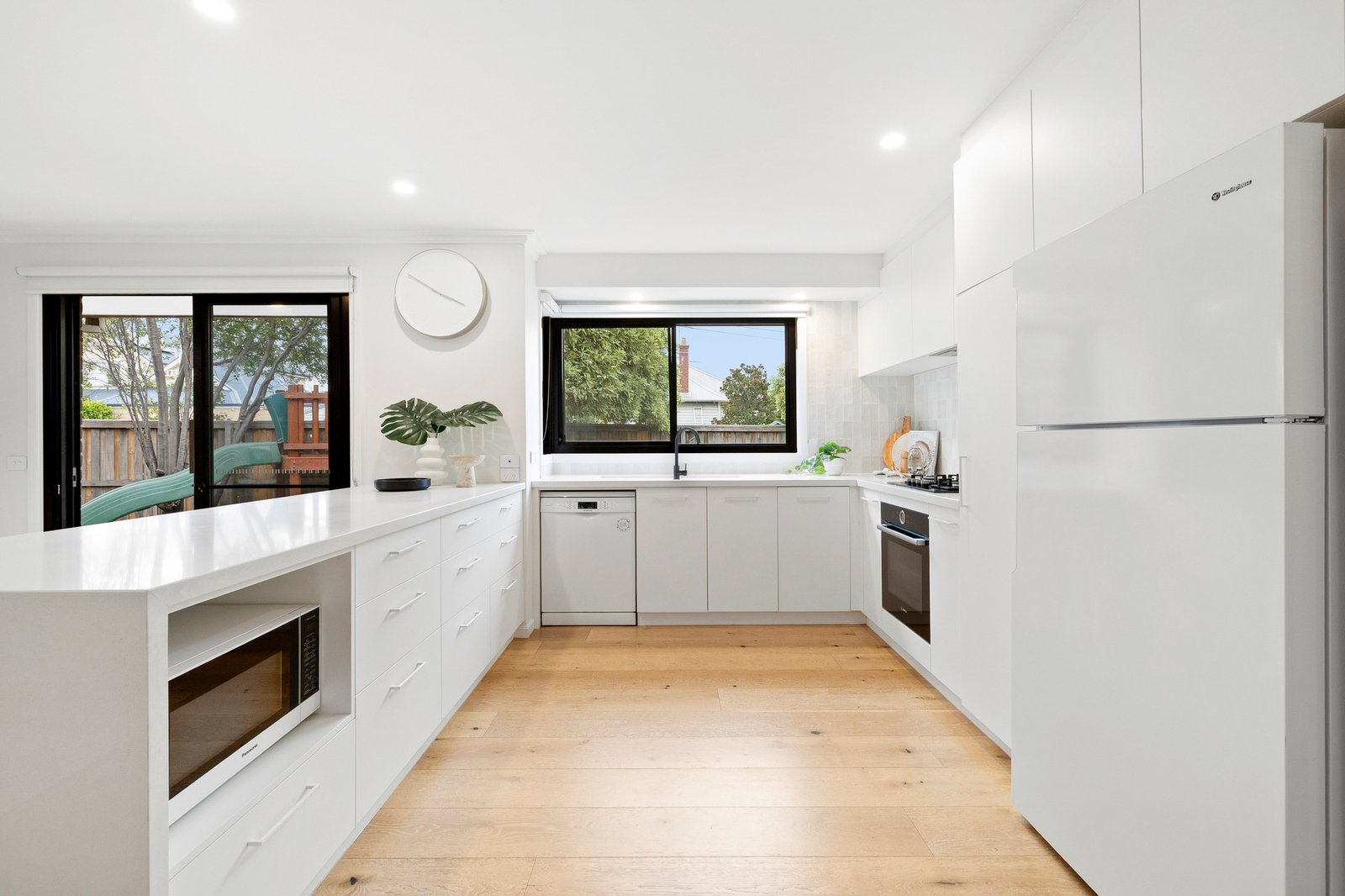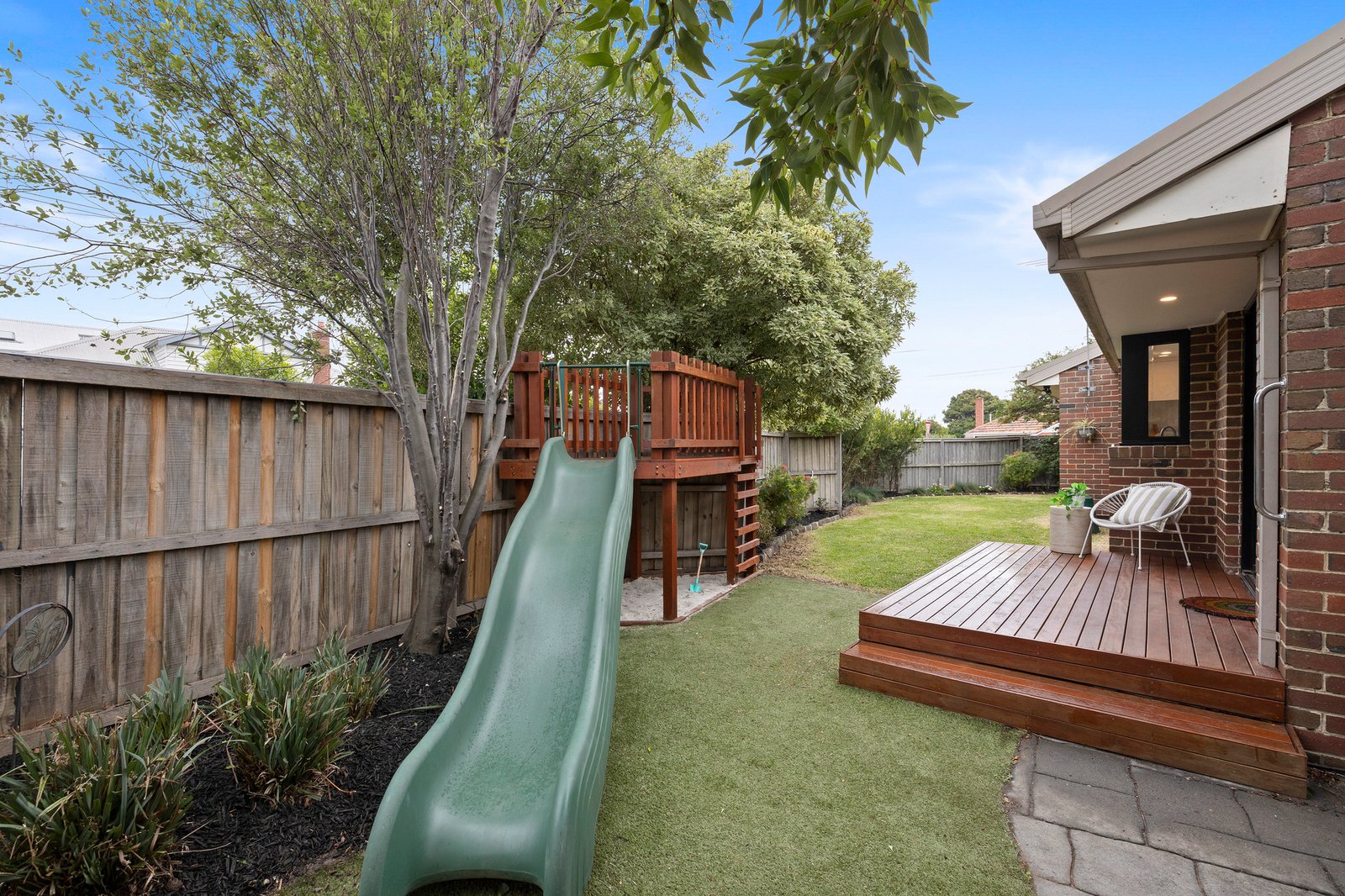 Revealing chic wide-board oak floors on entry, the flowing dual-zoned layout features a spacious light-filled living room to the front (with potential to convert to a third bedroom, if desired) then leads through to a contemporary kitchen boasting stone benchtops, quality Bosch appliances and a gorgeous, tiled splashback. The inviting entertaining area is desirably open plan and extends out to an alfresco patio, sundrenched deck and a surprisingly large north-facing garden with sweet play-fort and plenty of lawn to enjoy.