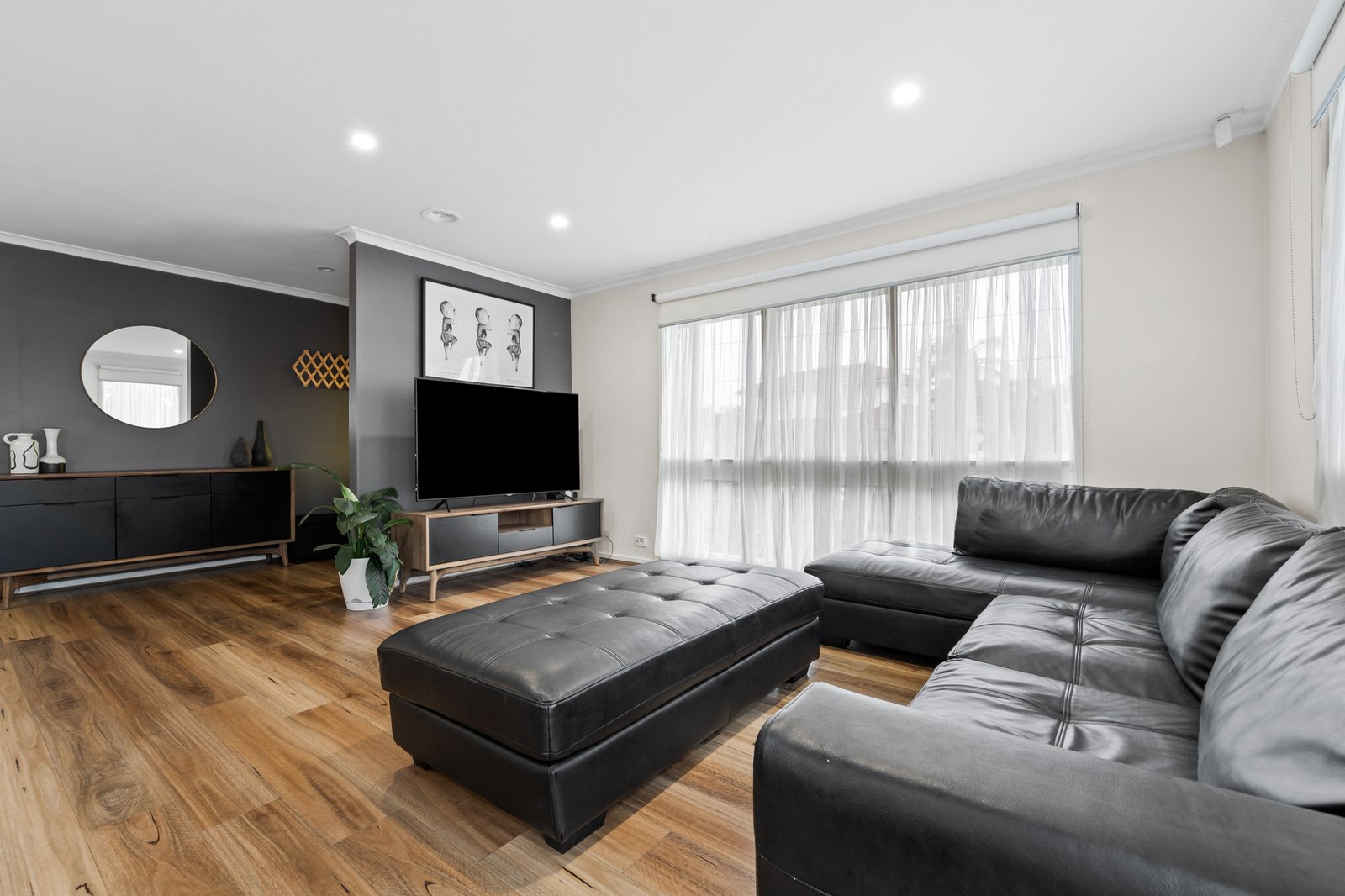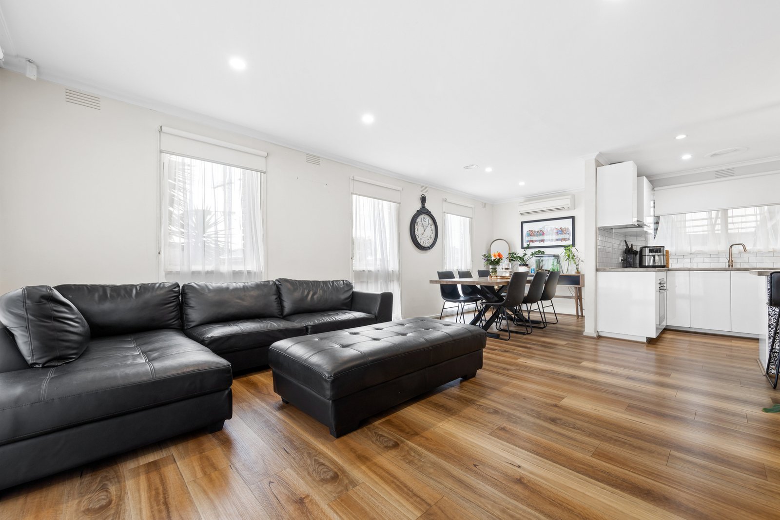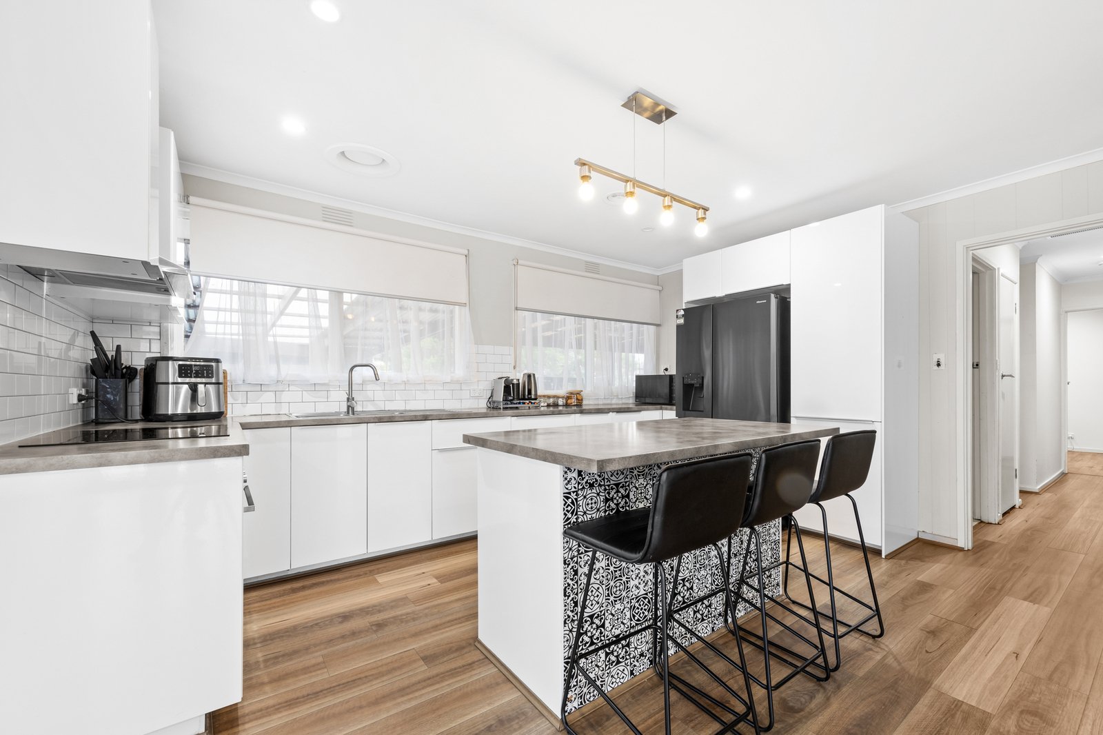 Anchored by an open plan living and dining zone, the layout is filled with natural light and features a stylish contemporary kitchen boasting all electric appliances and plenty of cupboard space plus an island bench for easy meals. Down the hall, the three bedrooms are comfortable and peaceful and share the modern central bathroom with a handy separate WC, while a laundry with garden access is also on offer.