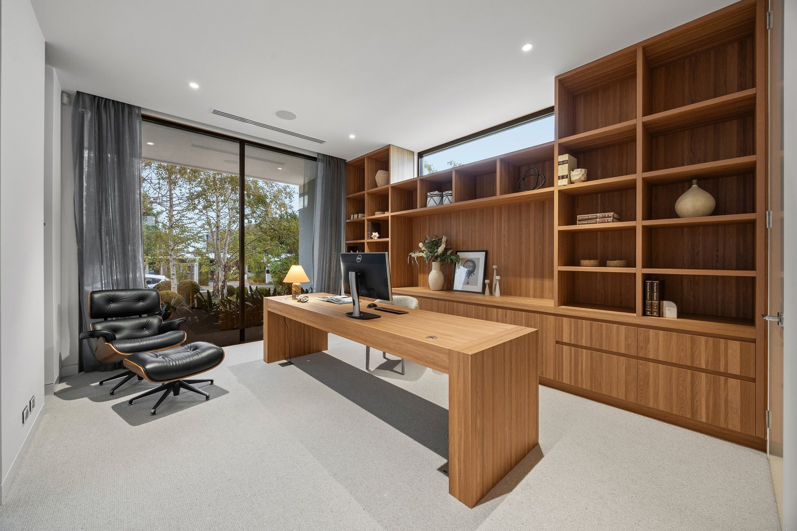 At the front, a home office provides a refined working environment where custom American oak joinery forms an entire wall of shelving and storage, while a high clerestory window filters light across the room.