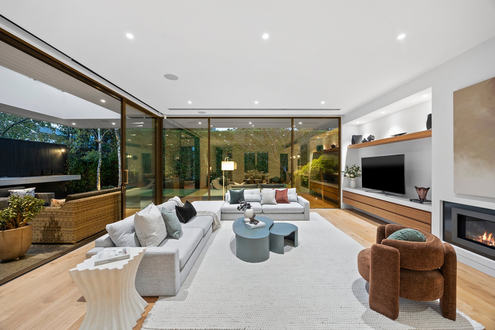 On either side of the courtyard, two living environments introduce flexibility to the ground floor. On one side, a welcoming retreat offers a quieter setting removed from the main entertaining areas, while a generous family room enjoys direct access to the rear.