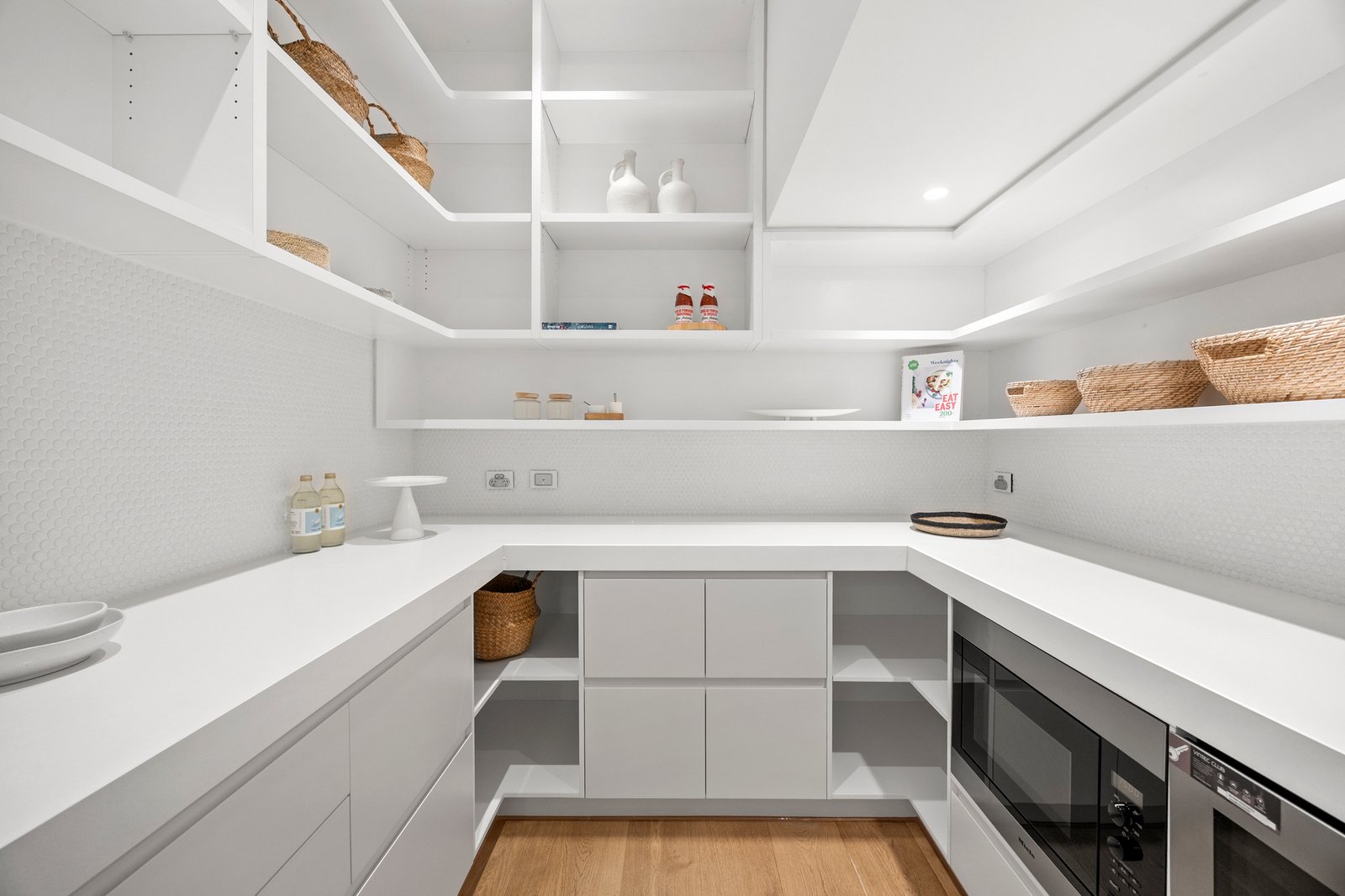 Centred on a broad stone island, the kitchen brings the surrounding spaces together, with streamlined cabinetry concealing Miele appliances of two ovens, steamer, coffee machine and integrated Liebherr refrigeration, while a butler’s pantry with Vintec wine fridge extends the preparation zone.