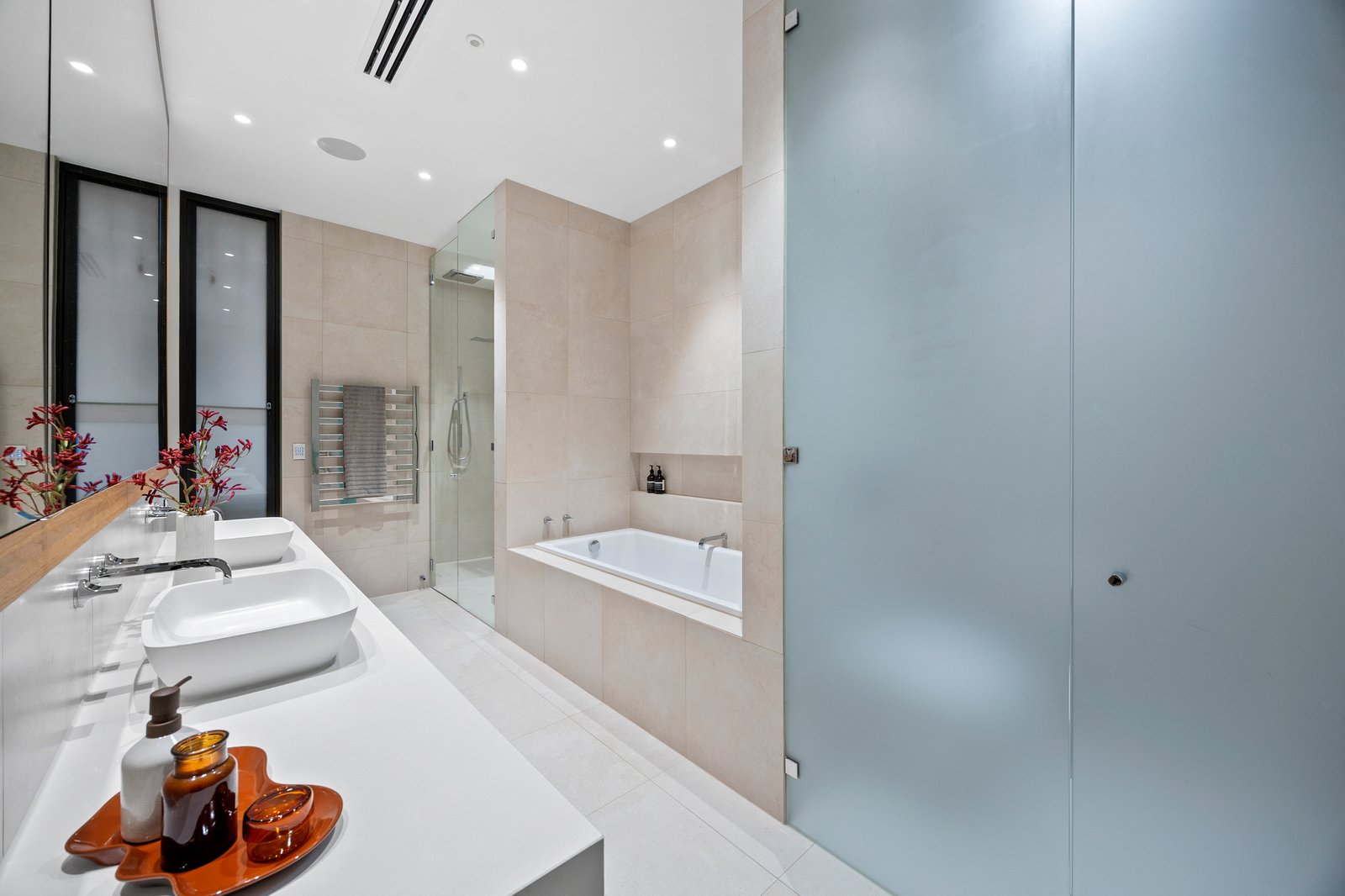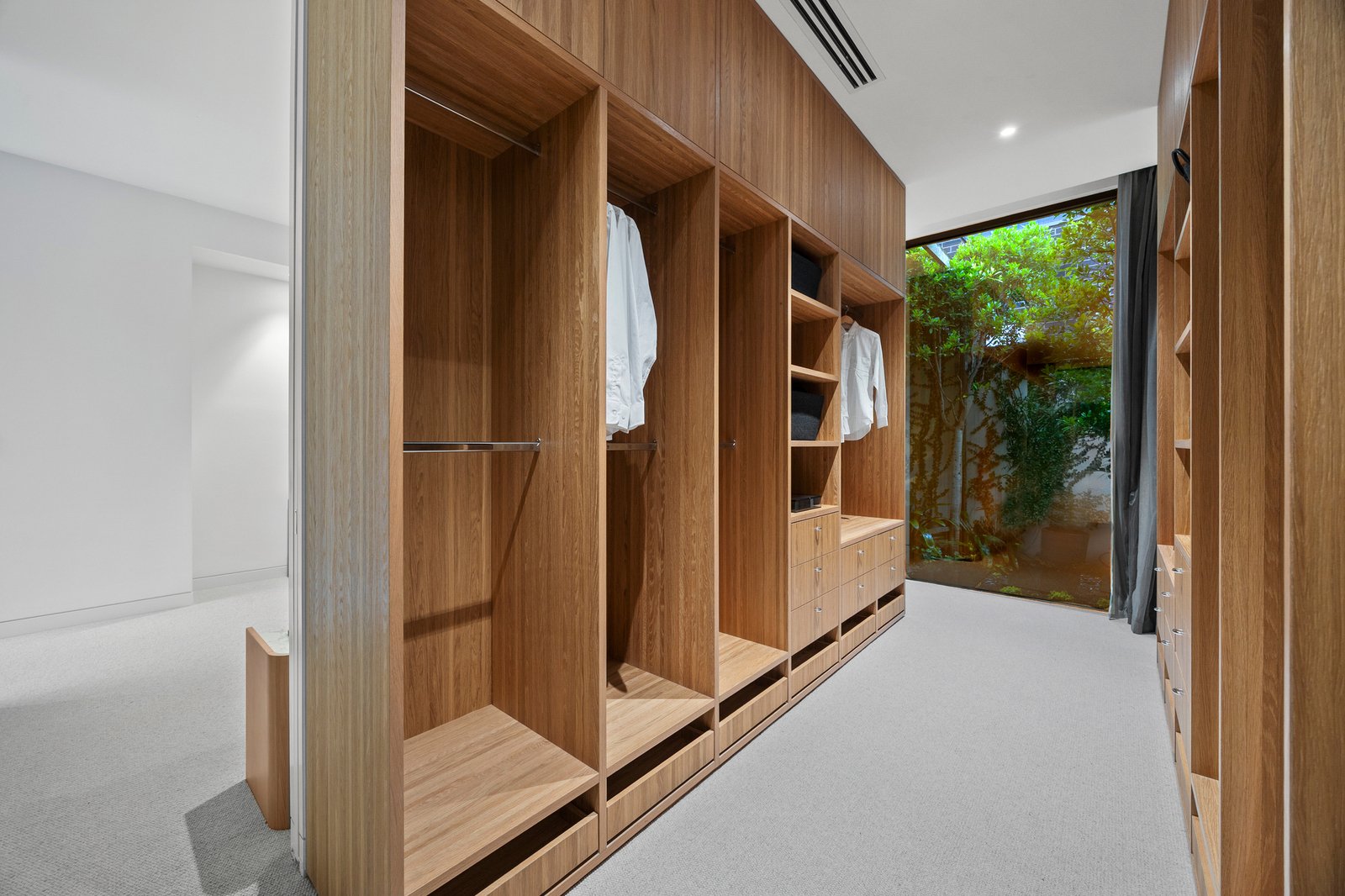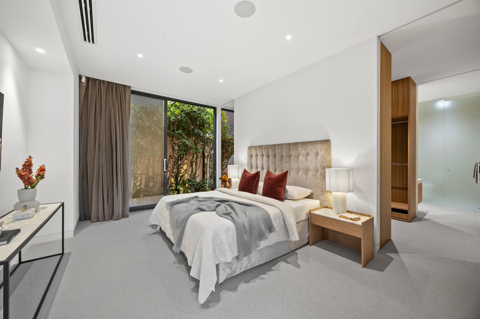 Accommodation is arranged across both levels, beginning with a secluded ground-floor main suite oriented to the garden through a wall of glass, accompanied by a generous dressing room and a luxurious twin vanity ensuite with bath and double shower.