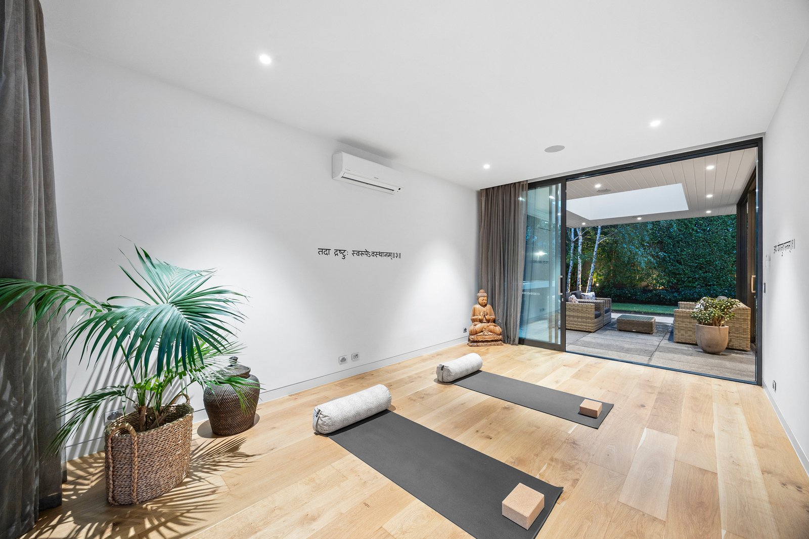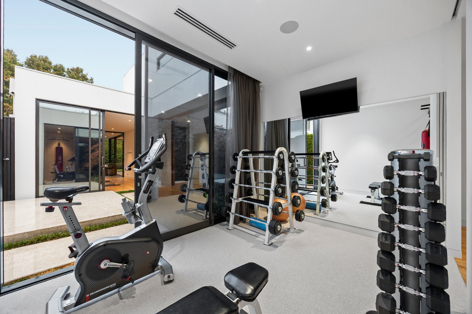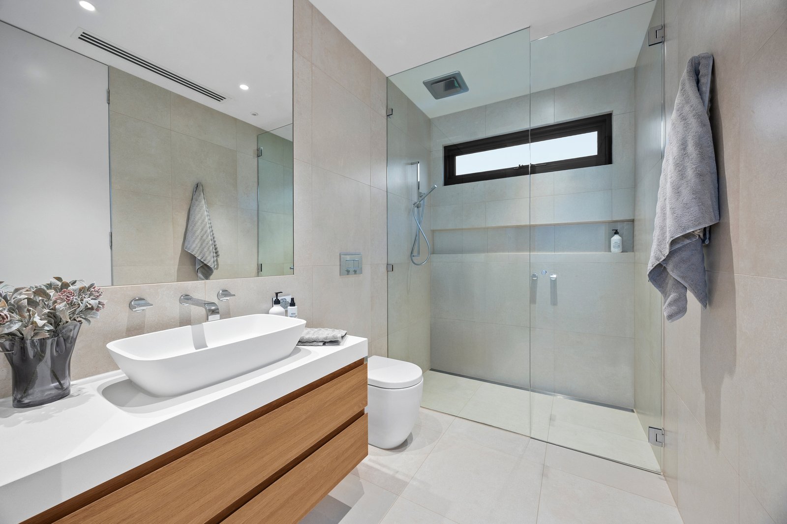 Accommodation is arranged across both levels, beginning with a secluded ground-floor main suite oriented to the garden through a wall of glass, accompanied by a generous dressing room and a luxurious twin vanity ensuite with bath and double shower.
