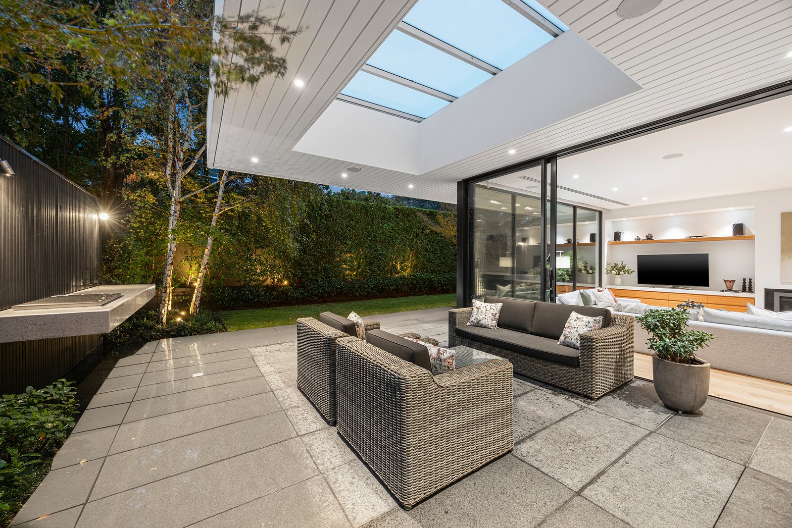 When the sliding glass withdraws, the living space seamlessly transitions to a north-facing terrace conceived as an open-air room. Overhead, a retractable glass skylight filters light into the covered entertaining area while providing shelter when required. A floating concrete bench and Beefeater gas BBQ complete a refined outdoor setting.