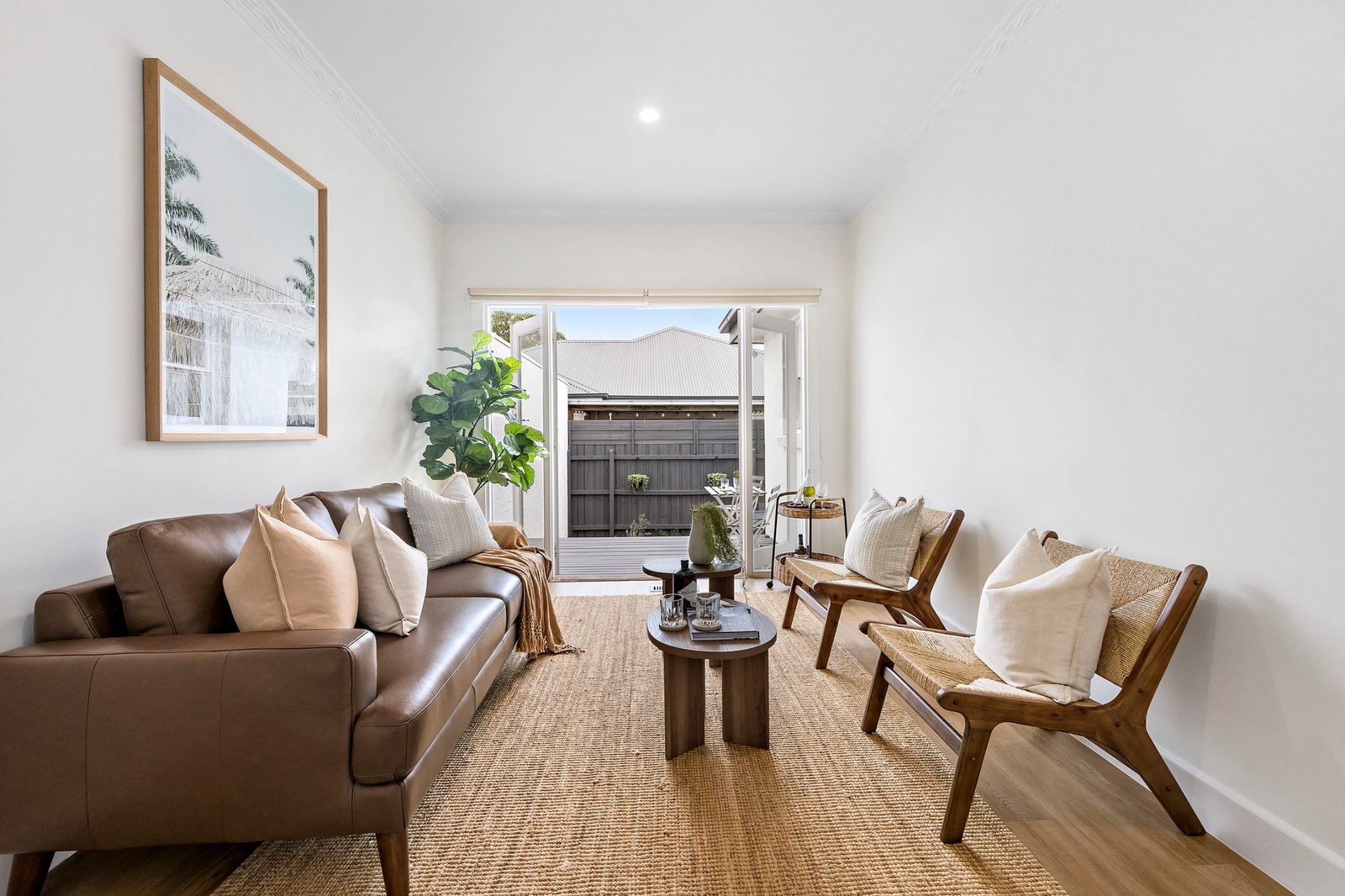 A second living area opens via French doors onto a tranquil, sun-drenched deck and private alfresco, ideal for relaxed outdoor dining and entertaining, framed by low-maintenance, coastal-inspired landscaping.