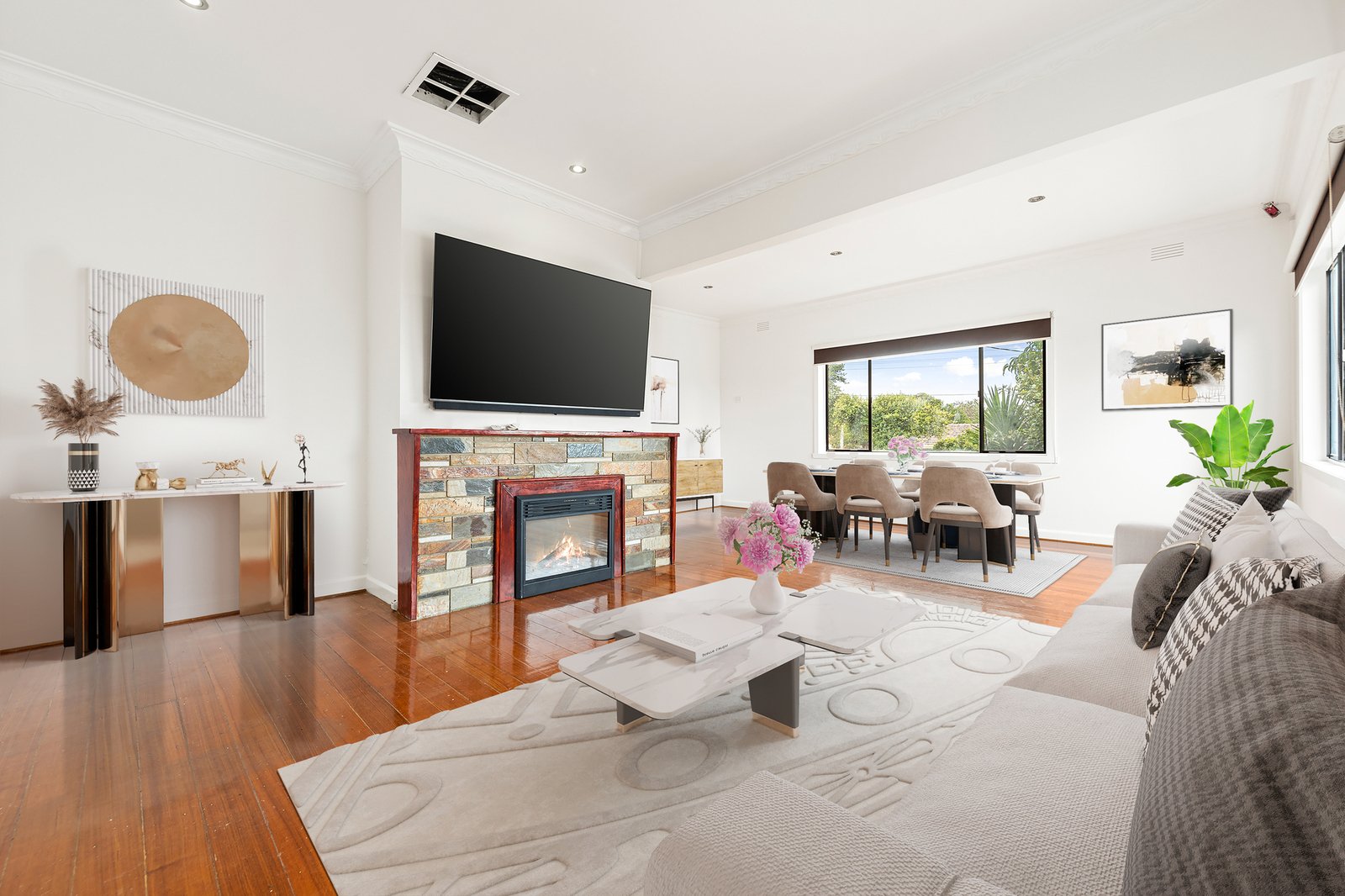 Beyond the classic exterior – you are instantly greeted by an ideal floor-plan; that will undoubtedly cater to various families. Polished timber floors add warmth through the spacious front living/dining zone, where a tiled fireplace adds character. From here, a relaxed meals area connects to the bright kitchen, featuring practical appliances and ample storage space.