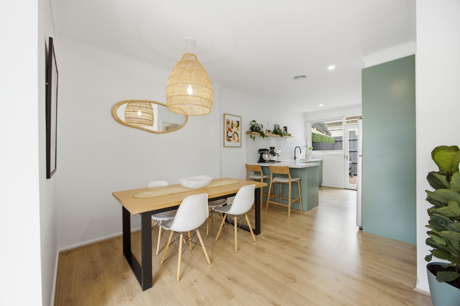 Northern light settles across a generously scaled living and dining domain, where warm timber floors and broad glazing draw the greenery inward and maintain a constant visual connection to the outdoors. The space reads open yet composed, with each zone clearly defined.