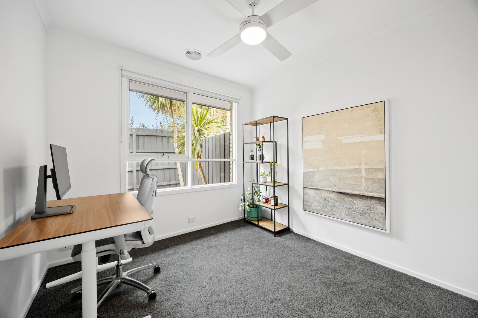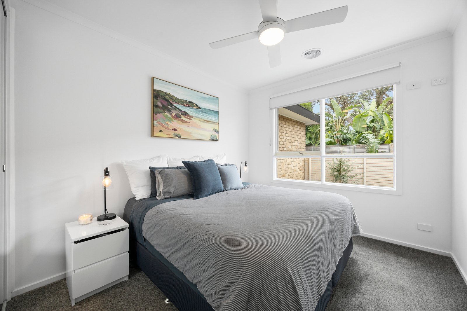Two bedrooms are positioned to capture distinct outlooks, one to the front garden, the other to the deck, each with mirrored robes and consistent natural light. The bathroom continues the home’s sleek aesthetic with a walk-in shower and stone vanity, accompanied by a concealed Euro laundry.