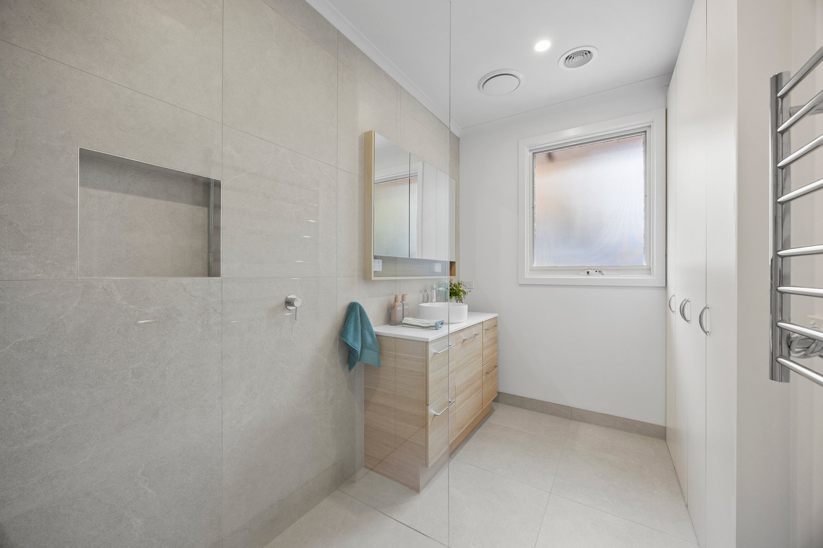 The kitchen sits naturally within this space, its tonal palette bringing softness to the clean-lined joinery. Bosch appliances, including a 4-burner cooktop, oven, rangehood and integrated dishwasher, unite with extensive storage, while a stone-topped breakfast bar forms a central point for everyday use.