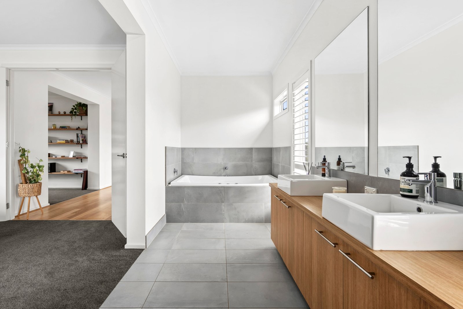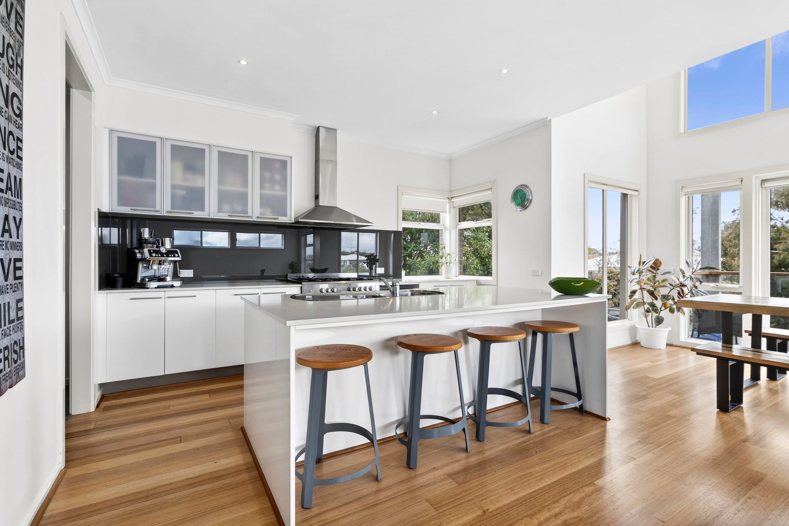 Set behind a high fence and established gardens, the striking two-storey façade introduces the coastal contemporary theme of the home. From the entry, a central staircase ascends to the main living, revealing a light-filled open plan layout featuring polished timber floors and a stunning void with large highlight windows allowing warm natural light to flow throughout. The quality kitchen features stone benchtops, a 900mm oven and cooktop, rangehood, dishwasher, sleek cabinetry, and a large walk-in pantry. The dining area features beautiful French doors opening out to the balcony, creating an effortless indoor-outdoor connection, and offering the perfect spot to enjoy your morning coffee or evening wine while taking in the tranquil coastal atmosphere. A spacious study on this level is fitted with built-in workstations and shelving, providing a well-equipped space to work from home.