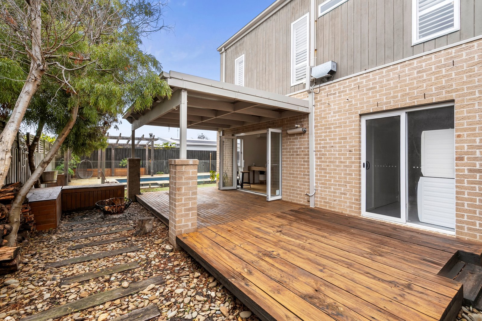 Outside, your private resort awaits, with an undercover alfresco adjoining a sun deck and firepit area with built-in seating, providing an impressive outdoor entertaining zone. The solar heated inground pool is accompanied by a paved pergola for poolside lounging, and a lush lawn area bordered by established trees. The double remote garage includes direct internal entry and pedestrian access to the backyard, with driveway space accommodating additional off street parking.