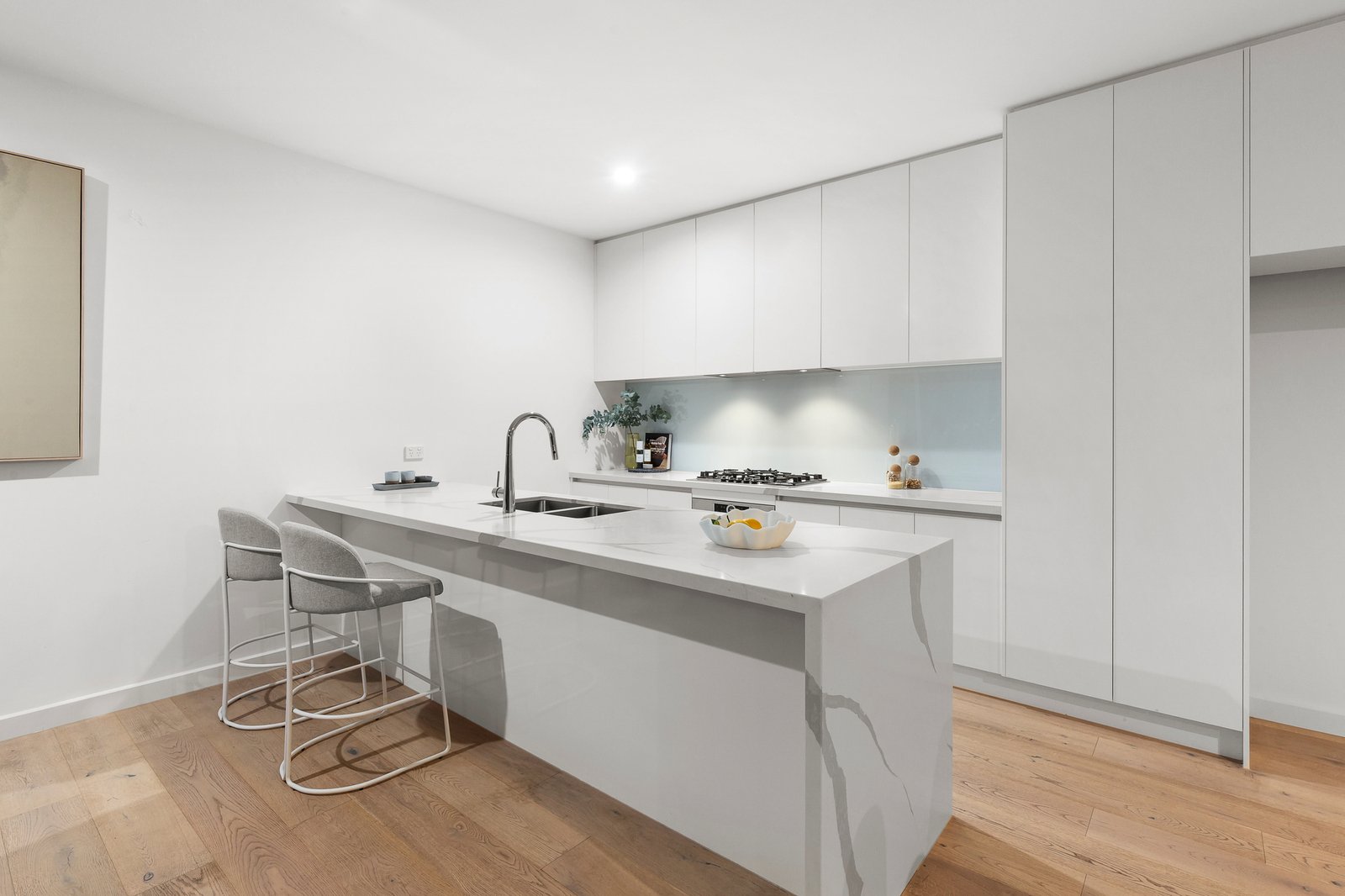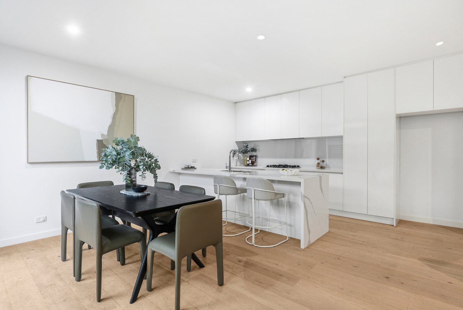 Appointed with high-level appointments including a full complement of Bosch appliances and a vast dining-bench of the entertainers’ kitchen, this high-quality home has a luxe fully-tiled private ensuite for each bedroom, cool coastal Oak floors in the latest limed finish and sleek stone benchtops throughout. Optioned up with individual reverse-cycle climate-control to virtually every room, there’s great storage for every bedroom; including a master dressing-room, a ground-floor walk-in robe and a deep corridor of robes for the third bedroom.