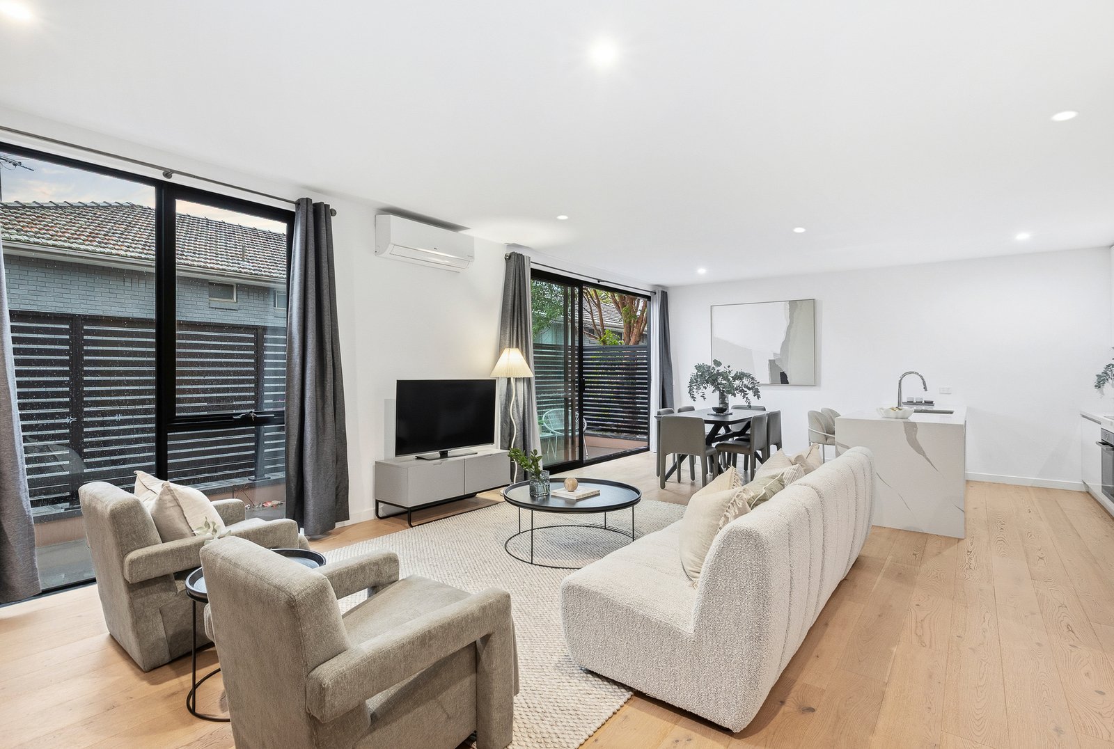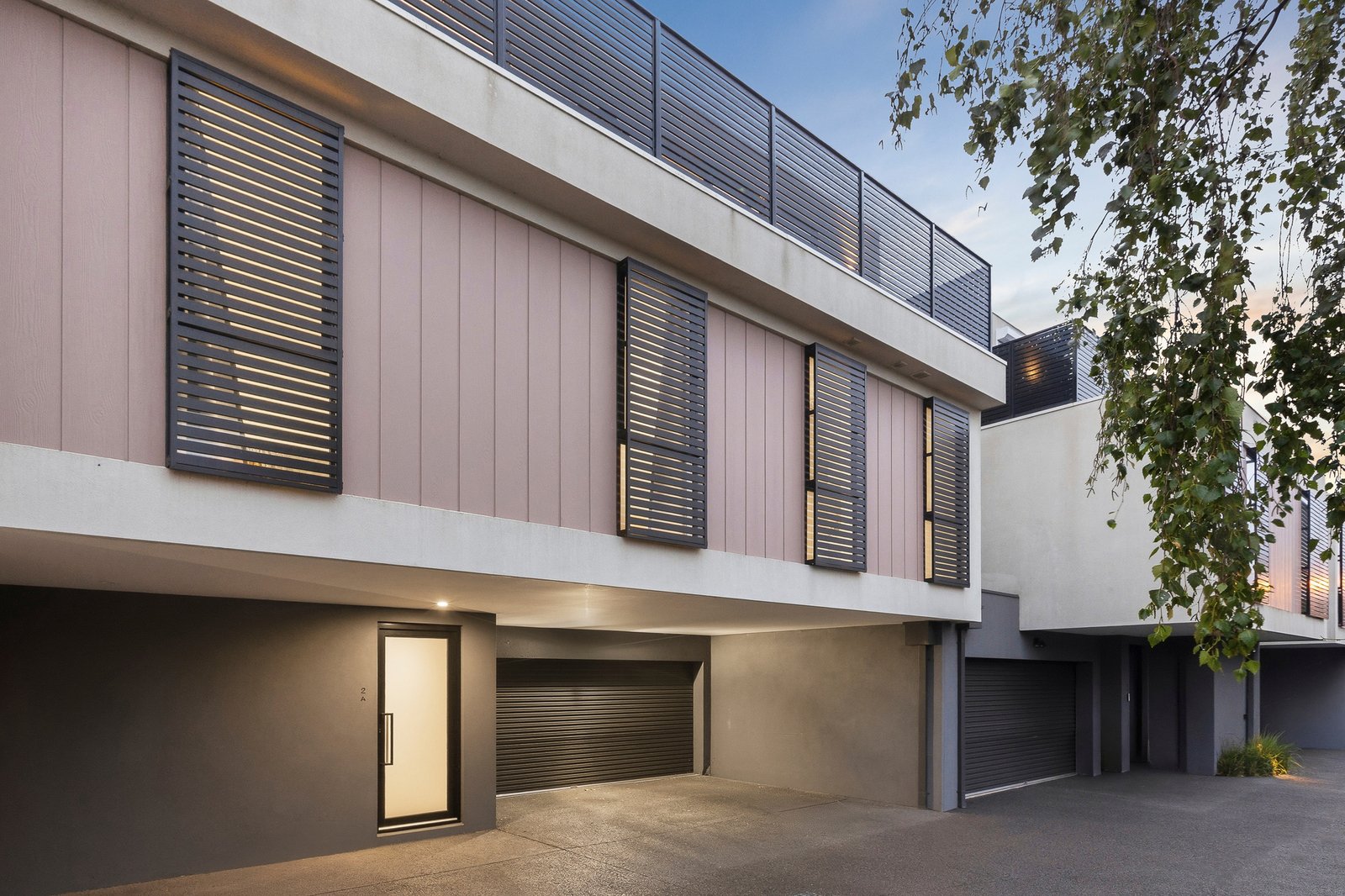 Cleverly configured with outdoor-access starting with a ground-floor courtyard, this innovative design has a full-width north-facing balcony for sun-soaked lounge-dining and top-floor bedroom and balcony views across the bay to Olivers Hill.