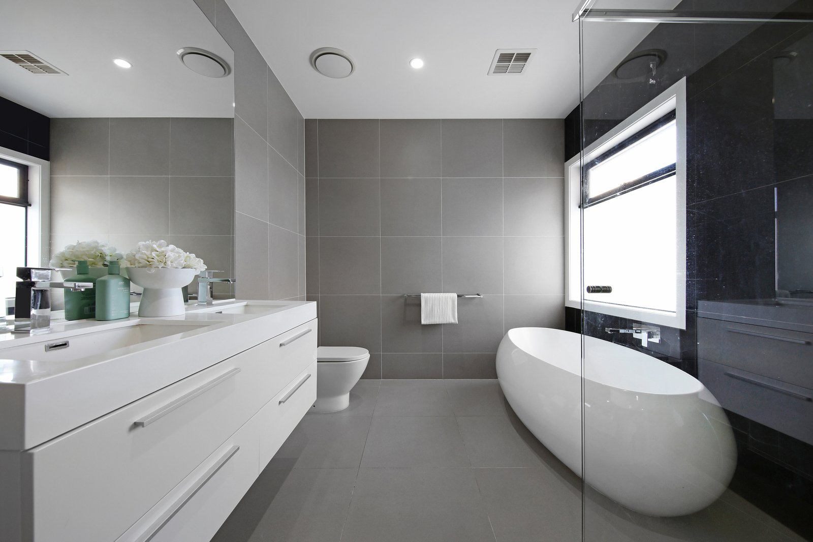 Up above, dedicated first-floor kids’ quarters (all double-sized and fitted with robes) are set around a double-doored central retreat easily reimagined as a fourth bedroom, while a big family bathroom is well-designed too – with designer fittings including a sculptural freestanding bath.