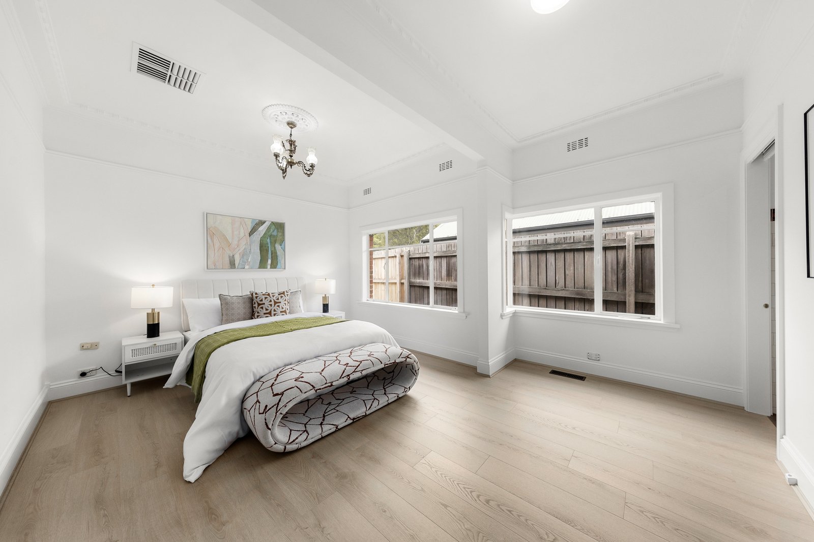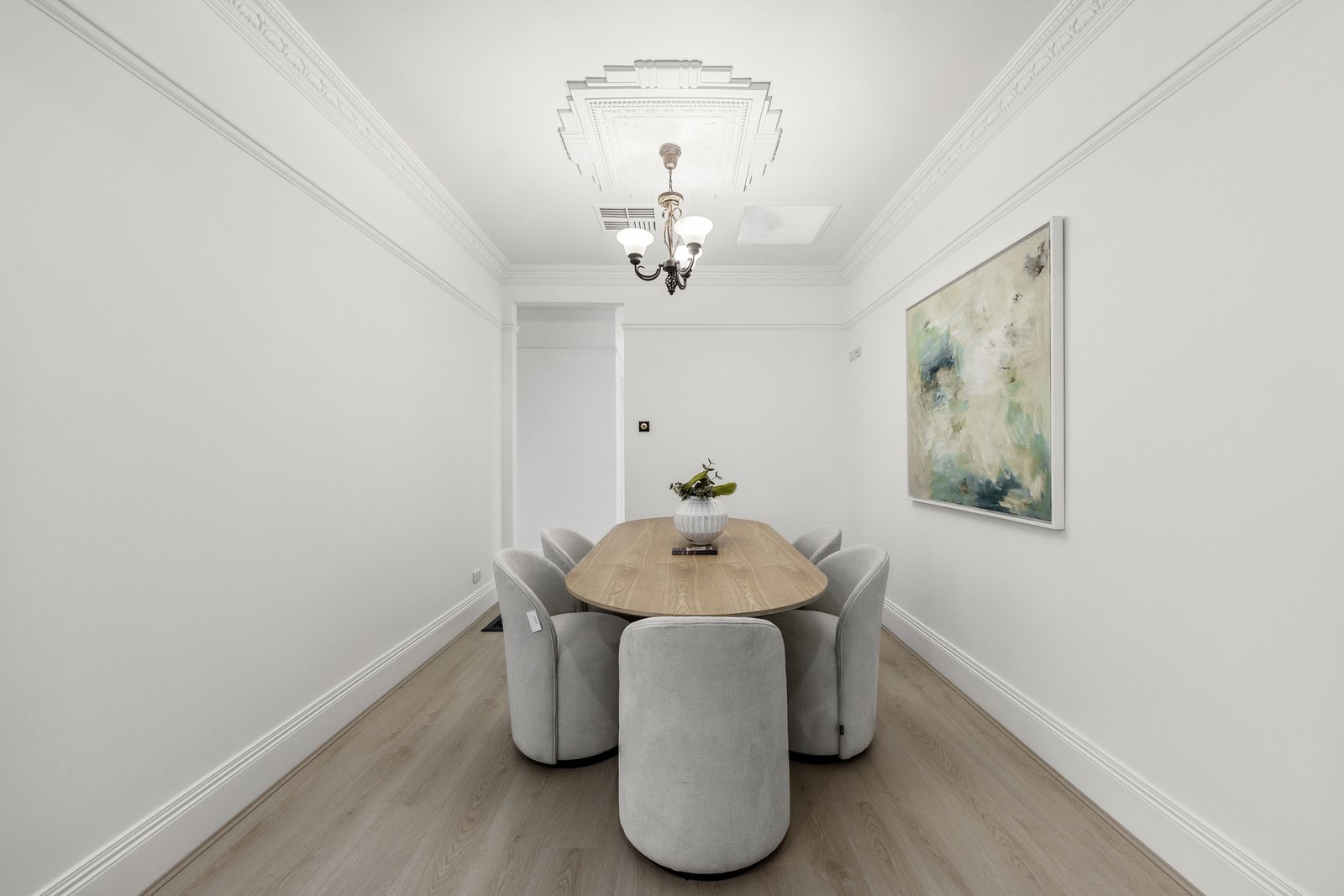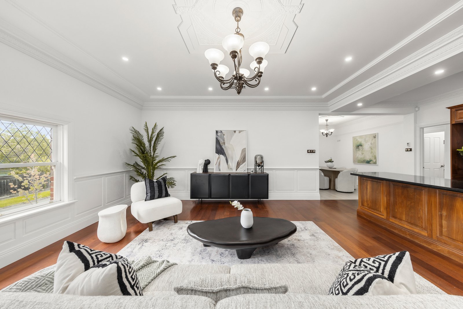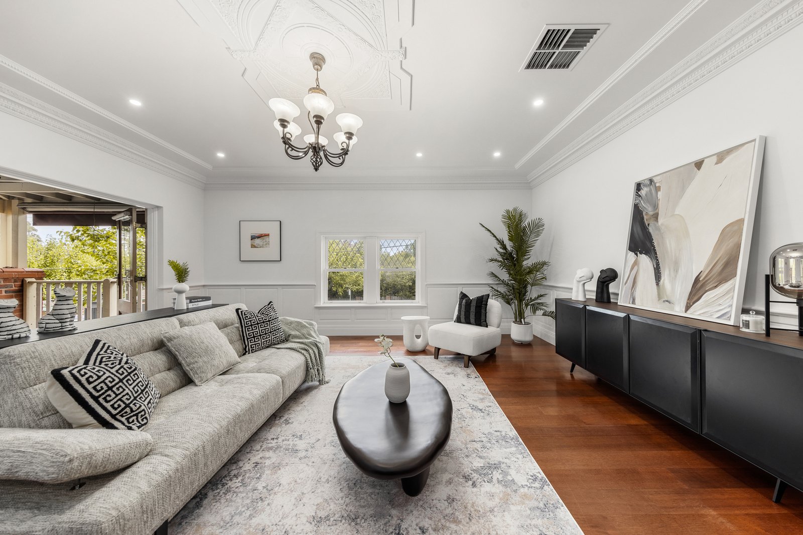 Period charm is evident throughout, with ornate high ceilings, decorative cornices, ceiling roses, picture rails and dado panelling, complemented by modern comforts including ducted heating, evaporative cooling, stylish window furnishings and excellent storage.