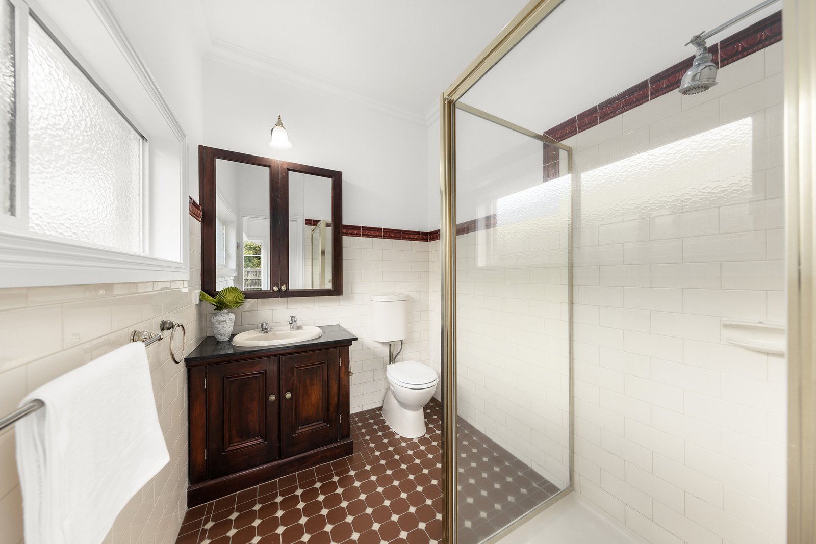 Both bathrooms are beautifully appointed in a character-inspired style, showcasing tessellated tiles, black granite benchtops and quality timber cabinetry.