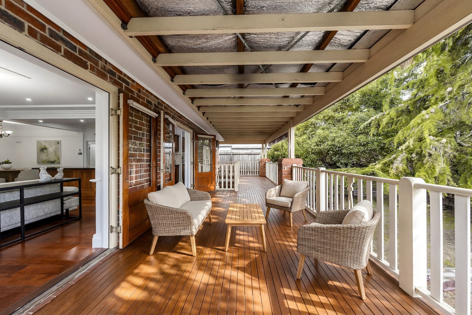 The adjoining light-filled dining and meals area flows seamlessly into the family room, with French doors opening onto an elevated deck. Complete with a roof and bistro blinds, this impressive space creates a year-round indoor-outdoor entertaining zone.
