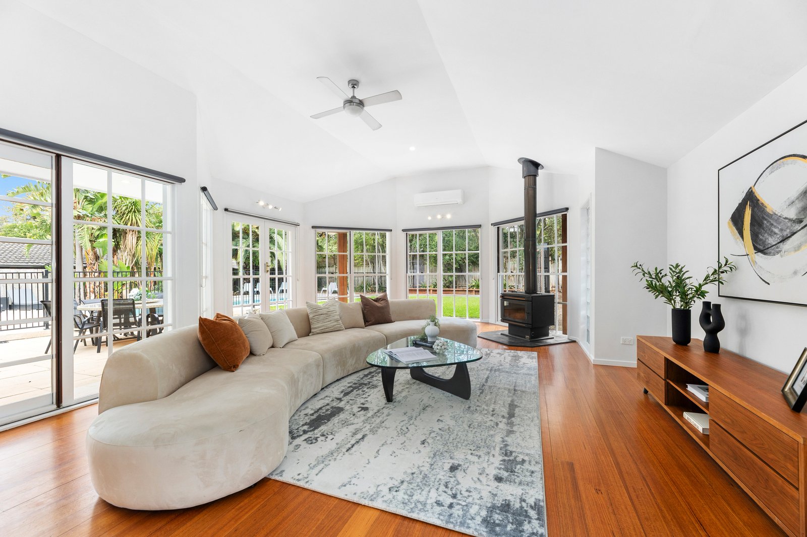 A high barn roof in the lavish sized rumpus makes the perfect adjoining party room, complete with a wood heater for the winter so you can cosy up around the fire.