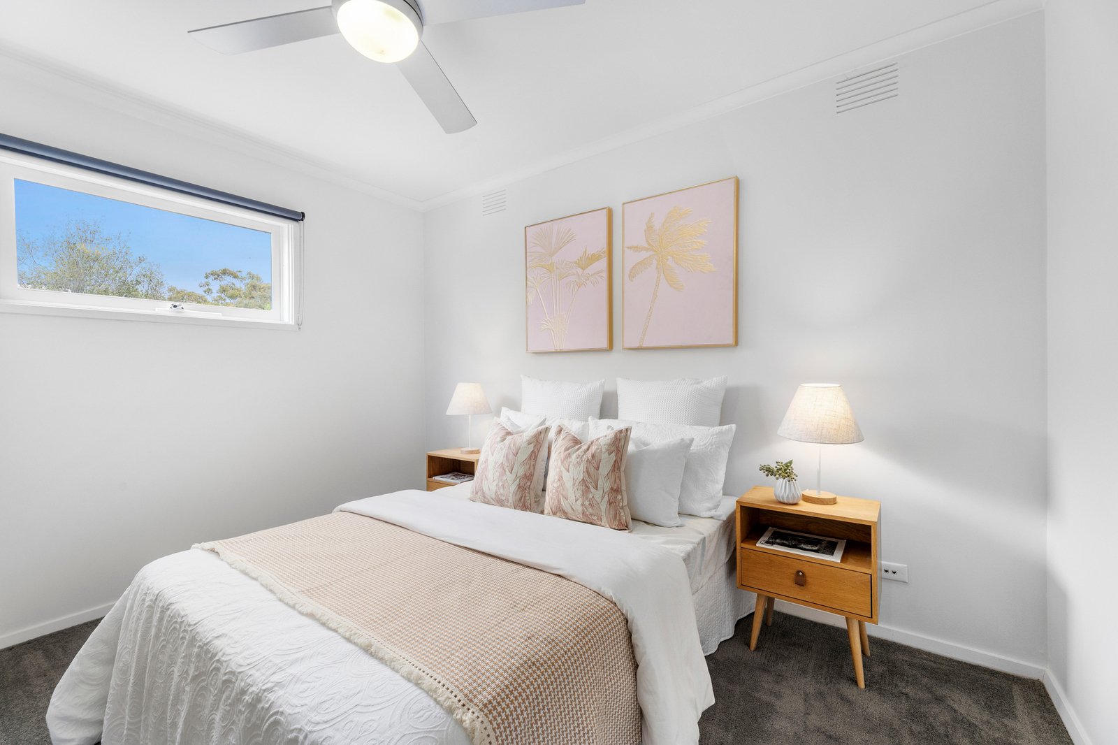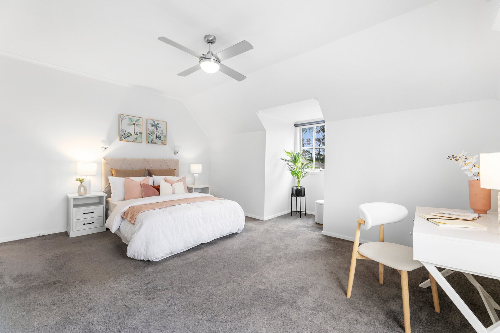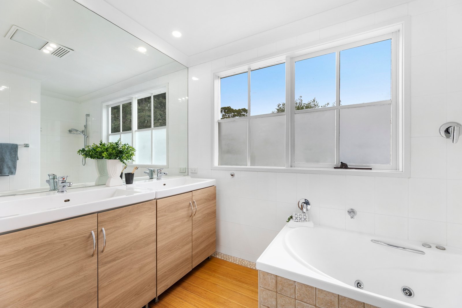 Upstairs, the bedrooms are sized to please and offer lovely district views through the feature windows, with access to a family bathroom complete with a regular shaped spa bath and twin basin vanities.
