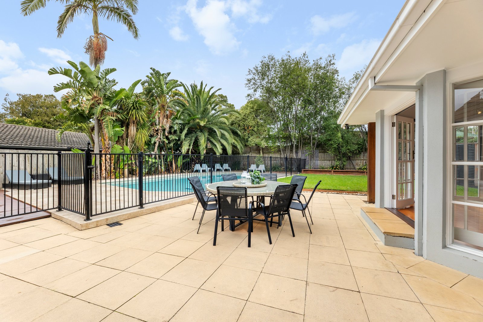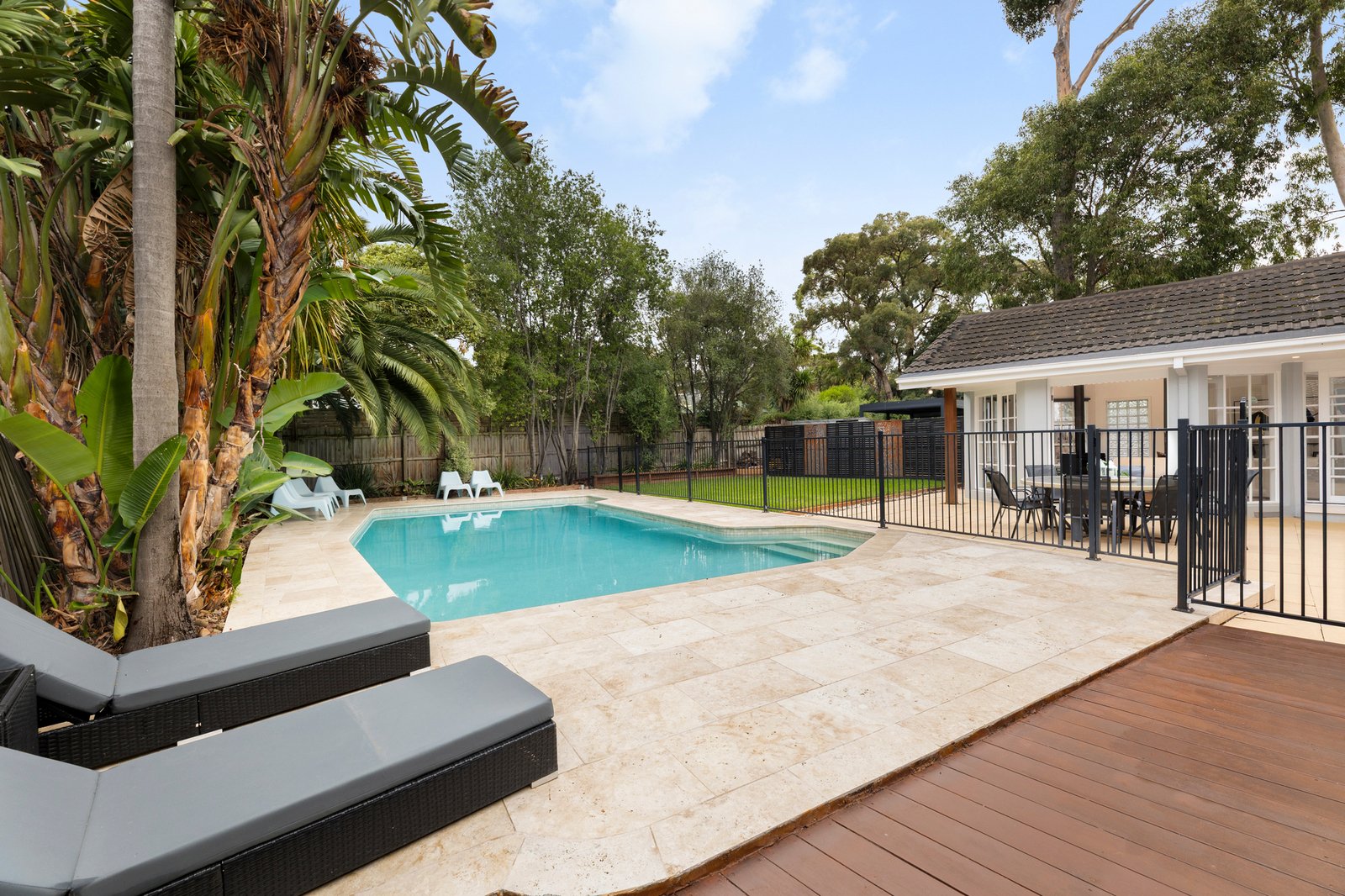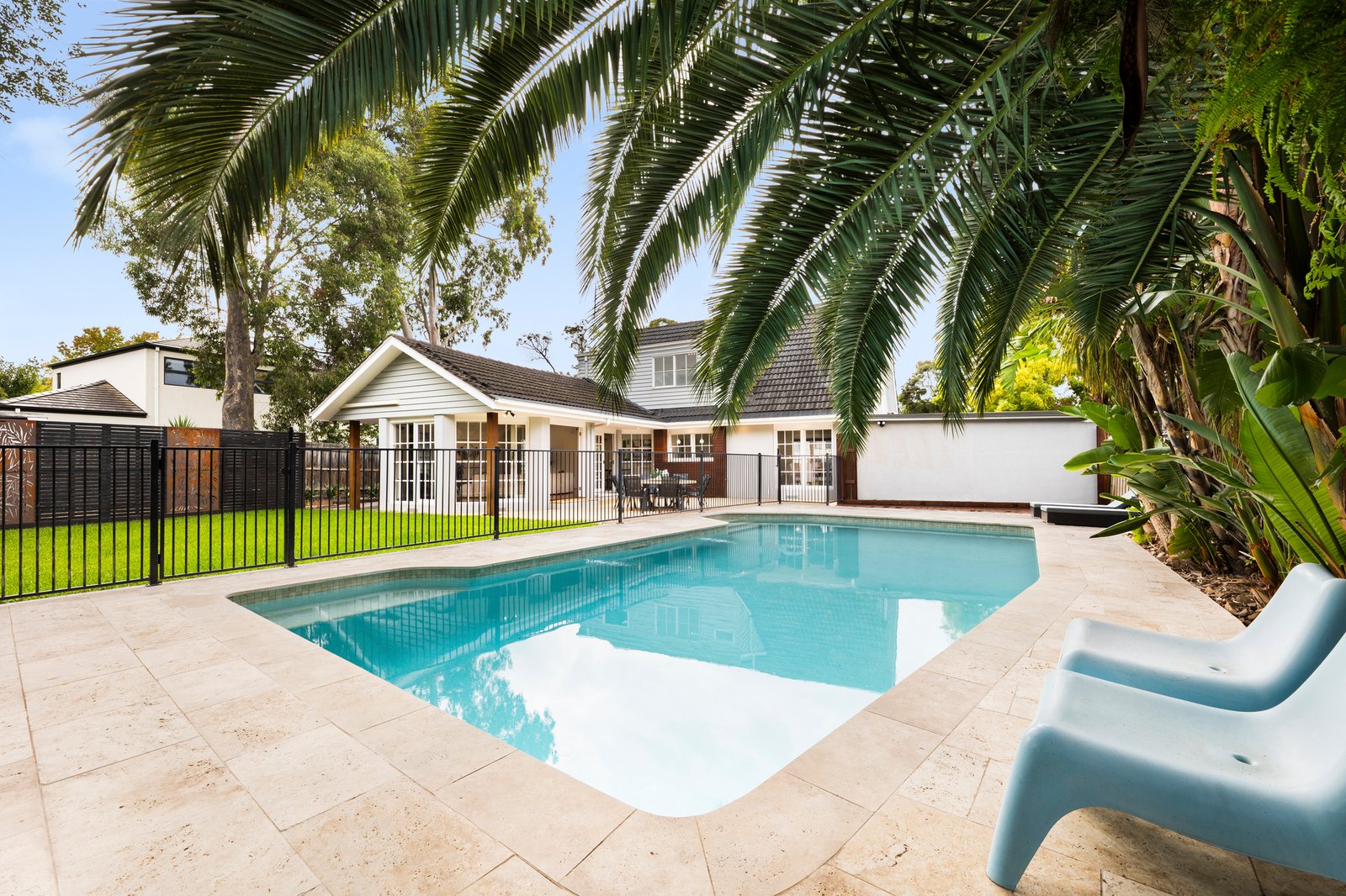 When it’s time to unwind, a spectacular outdoor entertaining area awaits – designed like a tropical resort with palm trees and Travertine paving around the in-ground pool.