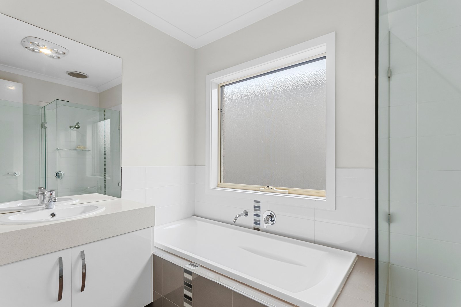 Two private bedrooms with built-in robes sit alongside a family bathroom and generous laundry, with the main bedroom set to enjoy a private front-facing position, accompanied by a walk-in robe and dual-vanity ensuite with heat lamp and skylight. Ducted heating and refrigerated cooling, split-system air conditioning, elevated ceilings, external awning, solar power, and a double garage with internal access complement the home’s modern and solid construction, just moments from local bus stops and Hasting’s Train Station, St Mary’s Primary School, and Hasting’s major retail, including Kmart, Woolworths and Coles.