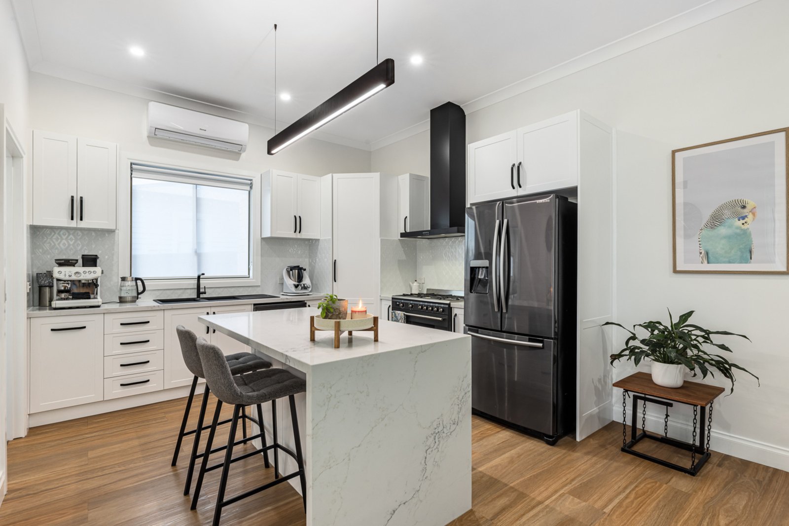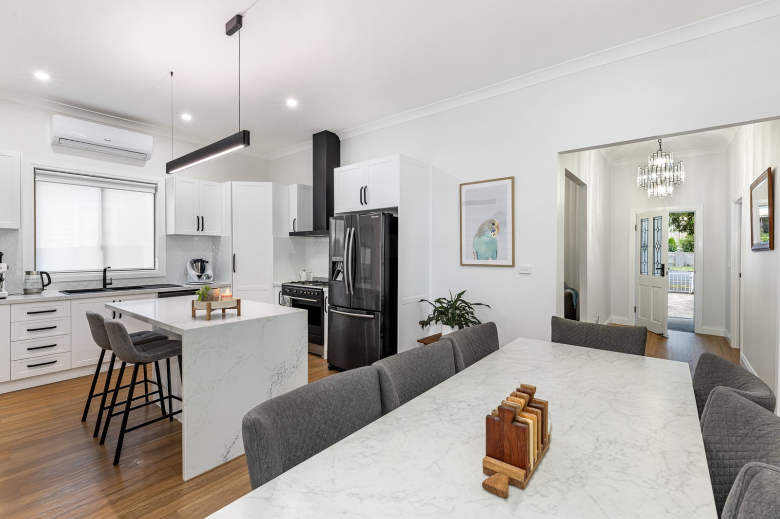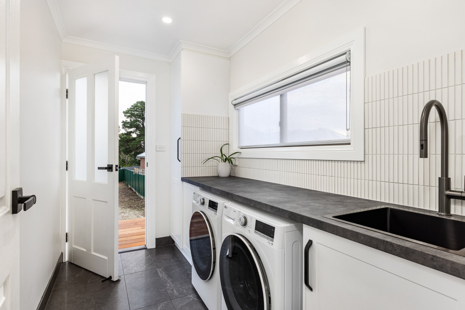 Inside, the home showcases soaring high ceilings along with character throughout with light-filled spaces and thoughtful layout having been fully renovated to combine character and contemporary design. The spacious master bedroom is a true retreat, featuring sheers, a ceiling fan, a walk-in wardrobe and a well-appointed ensuite with a large walk-in shower, vanity with storage and toilet. Two further bedrooms are generously sized, both with ceiling fans, with one also including built-in robes with full-length mirrors. The central bathroom is generous and stylish, complete with a tiled feature wall, large bath, shower, vanity with storage and toilet. At the front of the home, a formal living area offers a cosy yet spacious setting with a gas log fireplace and brick feature wall, split system air conditioner and sheers for privacy, all complemented by an abundance of natural light. The open-plan kitchen and meals area forms the heart of the home, featuring a waterfall edge island bench, ample storage, double sink with black accents and its own split system. There is a study nook area off the dining space that flows seamlessly out to a decked outdoor patio that overlooks the spacious backyard, creating the perfect setting for entertaining and with a blank canvas ready to design your own oasis along with rear lane access off of Dodds lane offering the option to build shedding or potential to subdivide STCA. Other key features include a large laundry with ample bench space, trough, storage and direct outdoor access adds further functionality and a 6.6kw solar system.