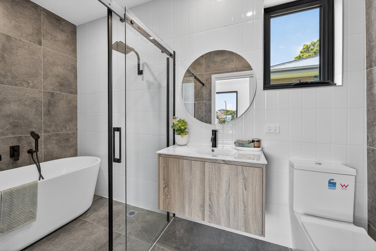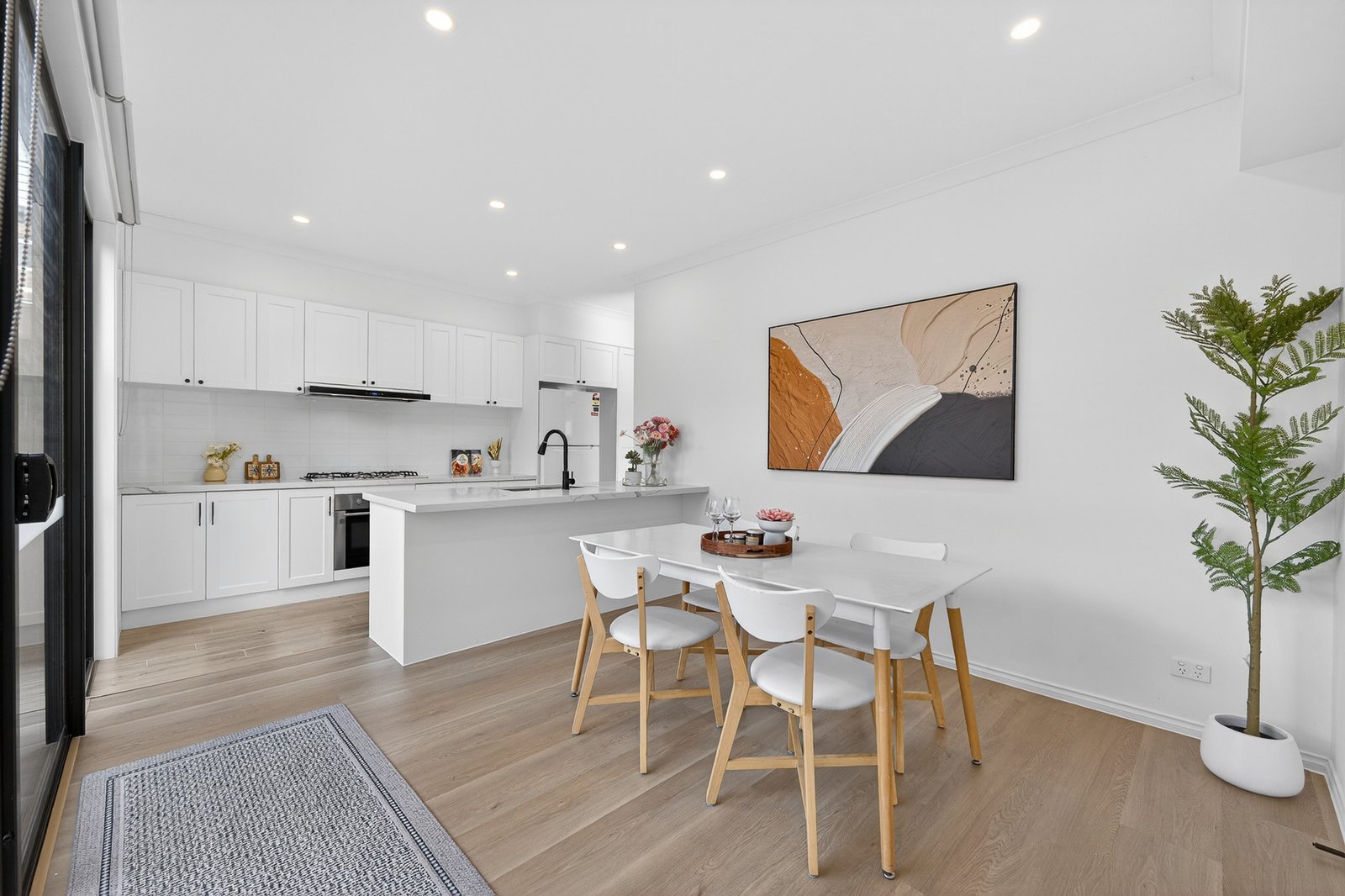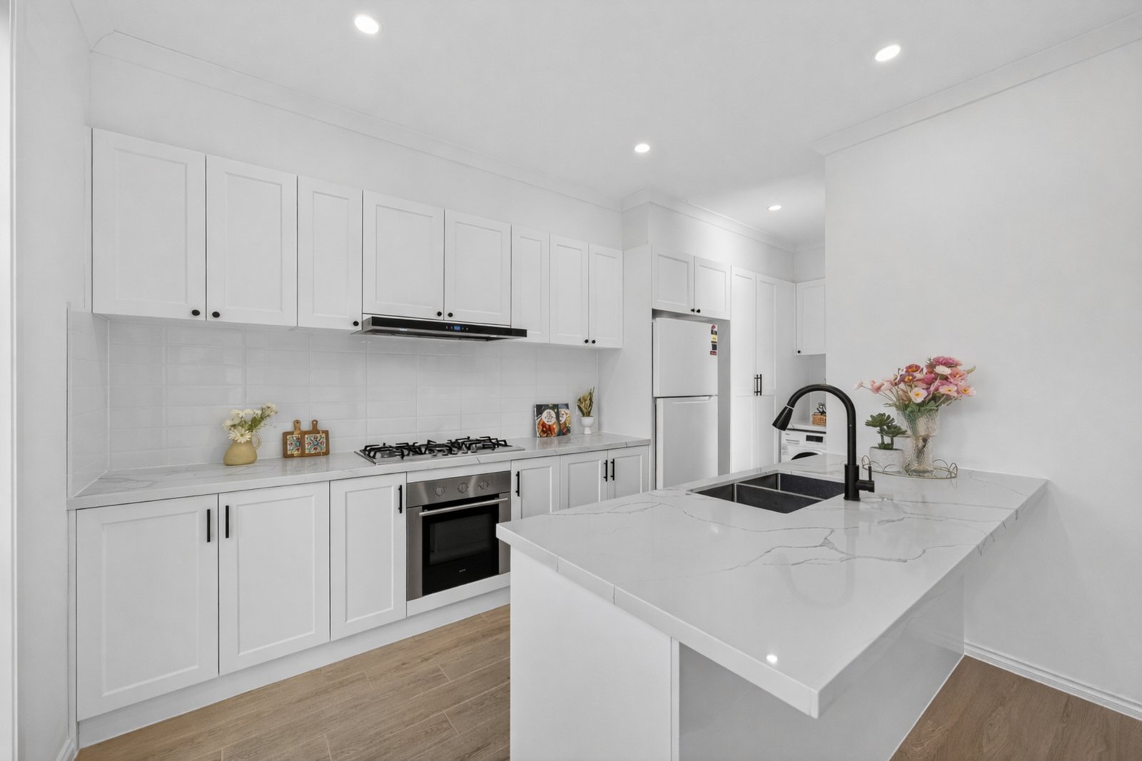 Bathed in natural light, the home showcases timber flooring and designer matte black tapware and hardware throughout, enhancing a thoughtfully designed floorplan. A ground-floor main bedroom features a luxurious fully tiled ensuite with a freestanding bath, while the French-style kitchen, finished with a premium 2 pac finish and appointed with high-quality Bosch appliances, features stone benchtops and flows seamlessly to the open-plan living and dining domain. Engineered floorboards are featured throughout the home, adding warmth and continuity to the interiors.