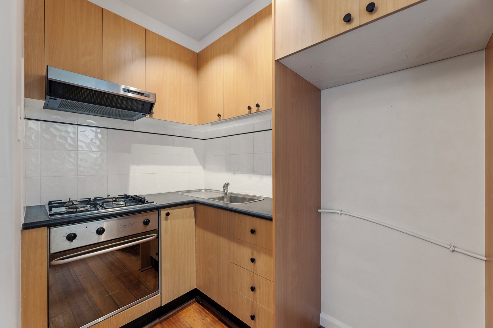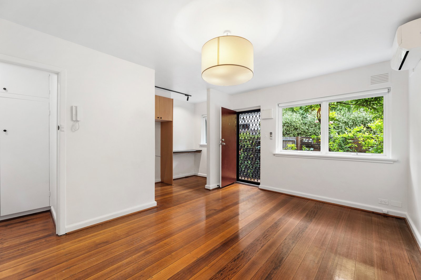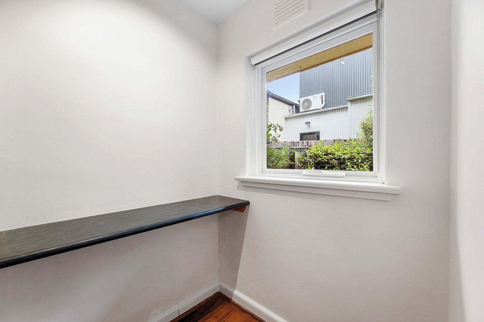 Inside, richly toned floorboards and leafy green outlooks create warmth and character throughout. The generous living and dining zone is fitted with a split-system air conditioner and flows seamlessly to a well-appointed kitchen with ample cabinetry and a breakfast ledge with room for stools. The bedroom includes built-in robes and its own separate heater for added comfort, while the bathroom has been tastefully refurbished with a shower-over-bath. Practical features include laundry taps and additional storage provided by hallway cupboards.