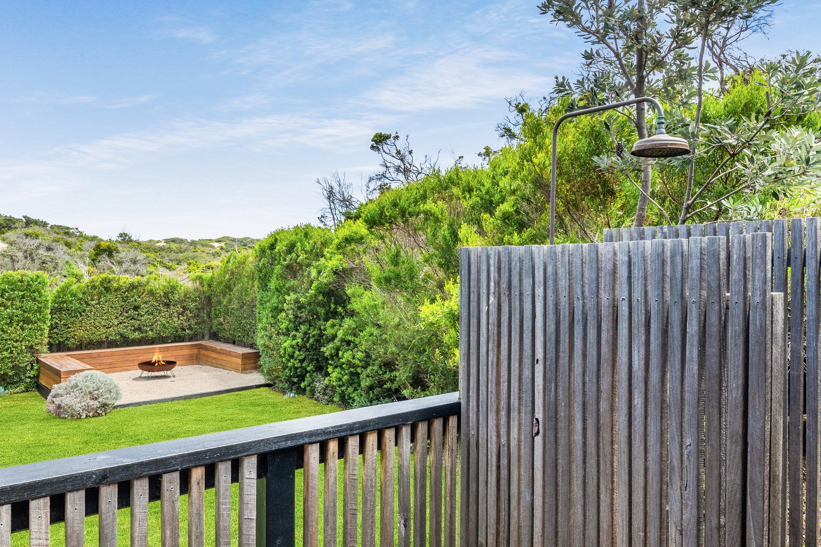 Natural Blackbutt flooring flows through the open living and dining zone, where a wood heater settles in for cooler nights and oversized glazing pulls the outlook close. The meals and kitchen area lead straight to an expansive deck that becomes the natural gathering point, equipped with quality appliances, sleek stone surfaces and plenty of storage. Days stretch between quiet coffees outside, late-afternoon barbecues, and evenings around the fire pit under a sky full of stars, with the National Park and the sound of the ocean providing the property's idyllic backdrop. After surfing sessions or long beach walks, the outdoor shower removes the sand, and the lawn offers space for play and scope for a future pool (STCA).