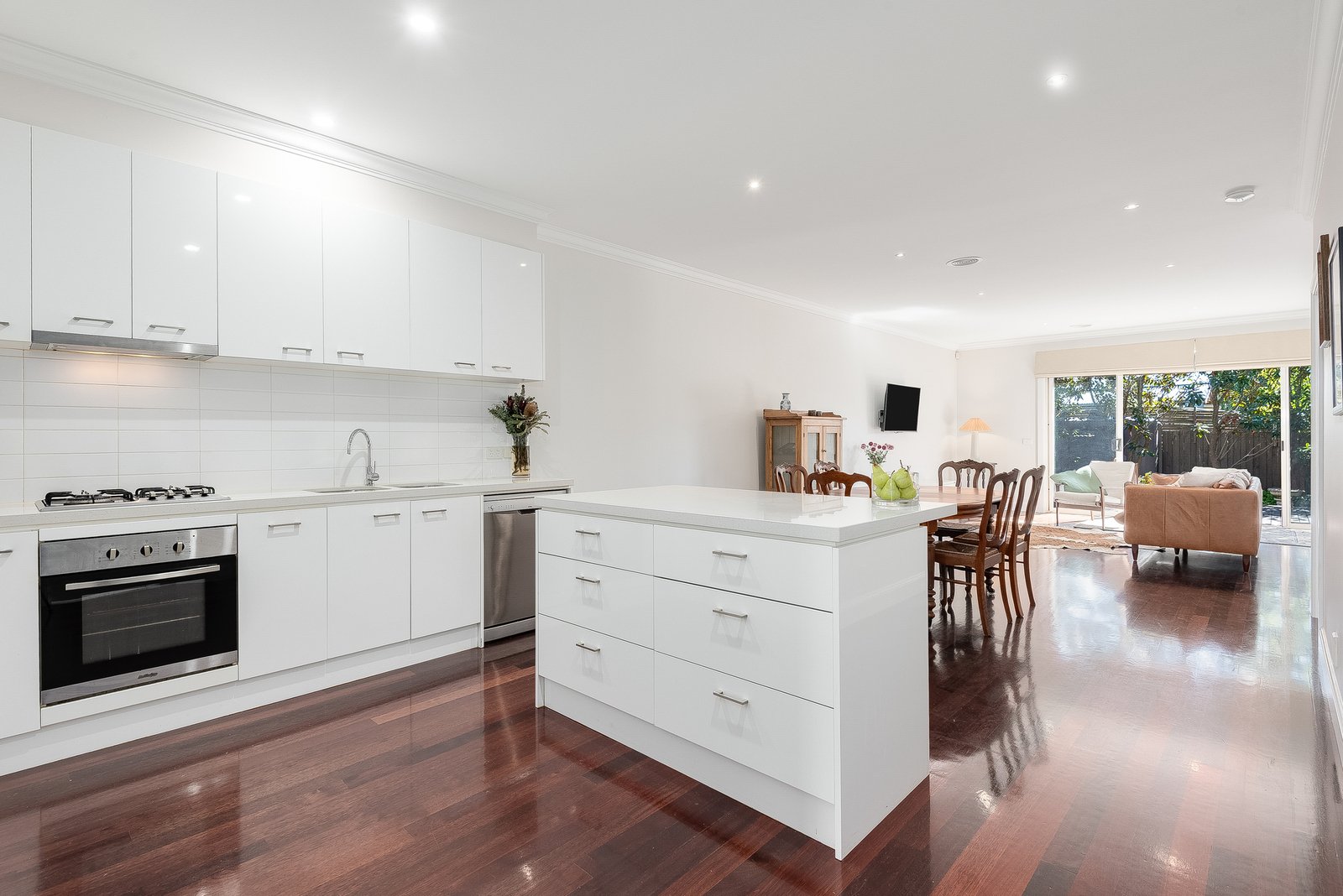 Set behind a picket fence and established gardens, the traditional façade offers timeless appeal. Inside, a central hallway guides you through the length of the home, featuring beautiful polished timber floors and spacious, neutral interiors. The open plan kitchen, dining and living area’s glass sliders connect to the leafy outdoor entertaining area, allowing warm natural light to flow within. The quality kitchen features stone benchtops and stainless steel appliances including a 600mm oven, gas cooktop and dishwasher with ample bench space and generous storage for keen home cooks.