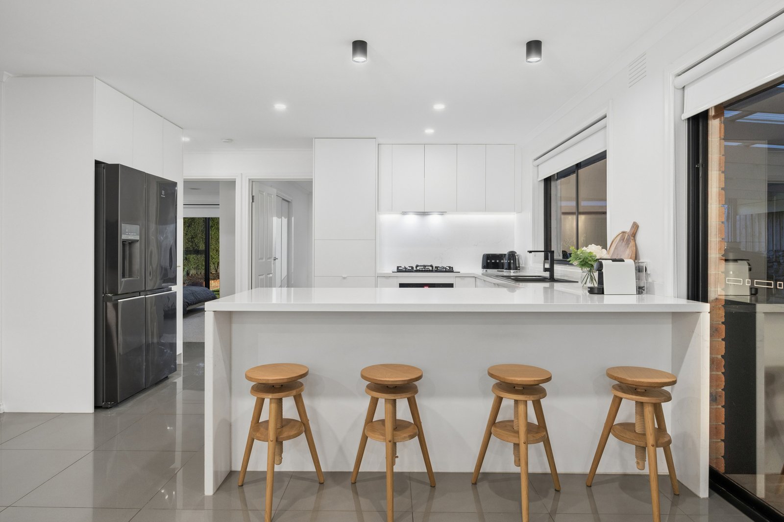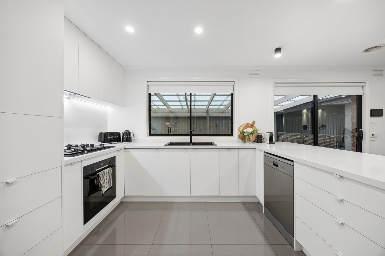 Screened from passers-by thanks to a high wall, the home’s smartly rendered façade opens to interiors that are warm, welcoming and impeccably presented throughout. With dual living zones for optimum harmony, among its highlights are an inviting lounge, adjacent dining area, a relaxed family room and sophisticated gourmet kitchen which impresses with luxe stone surfaces, clever storage, German soft-close drawers & cupboards, a granite sink and premium Smeg/Bosch appliances.