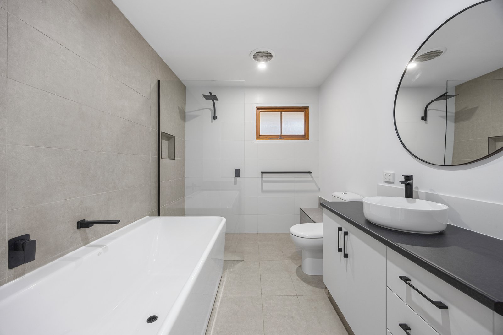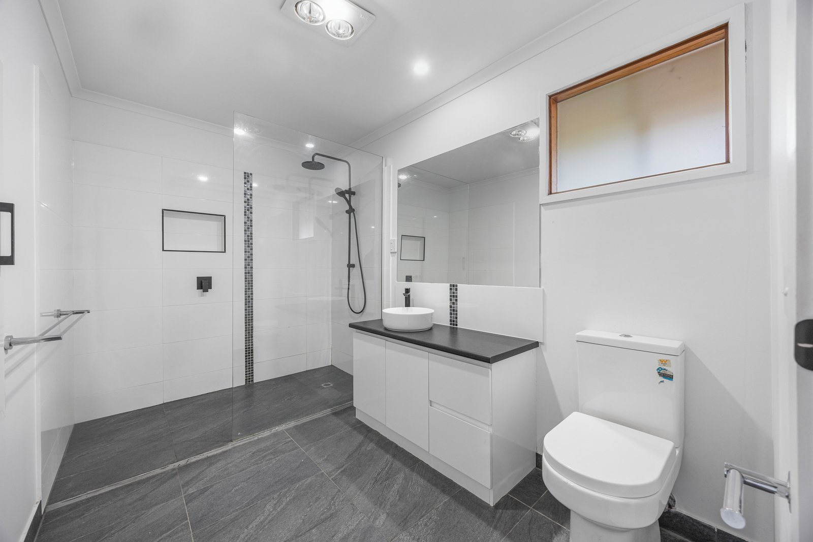 - Family bathroom with shower, bath, vanity and toilet