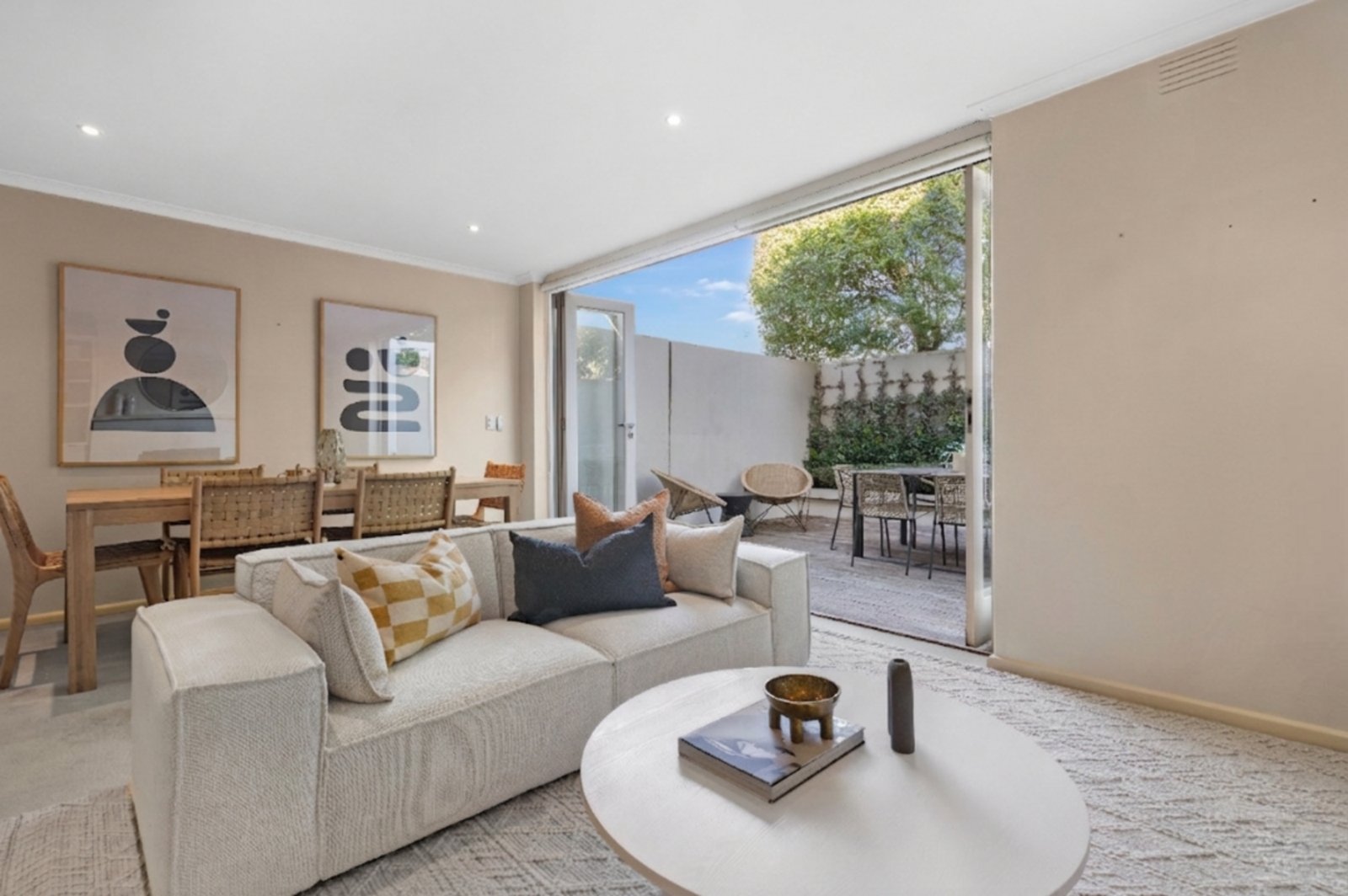 The light-filled open plan living and dining area, warmed by a gas log fireplace, flows to a private entertaining deck with retractable awning and outdoor...