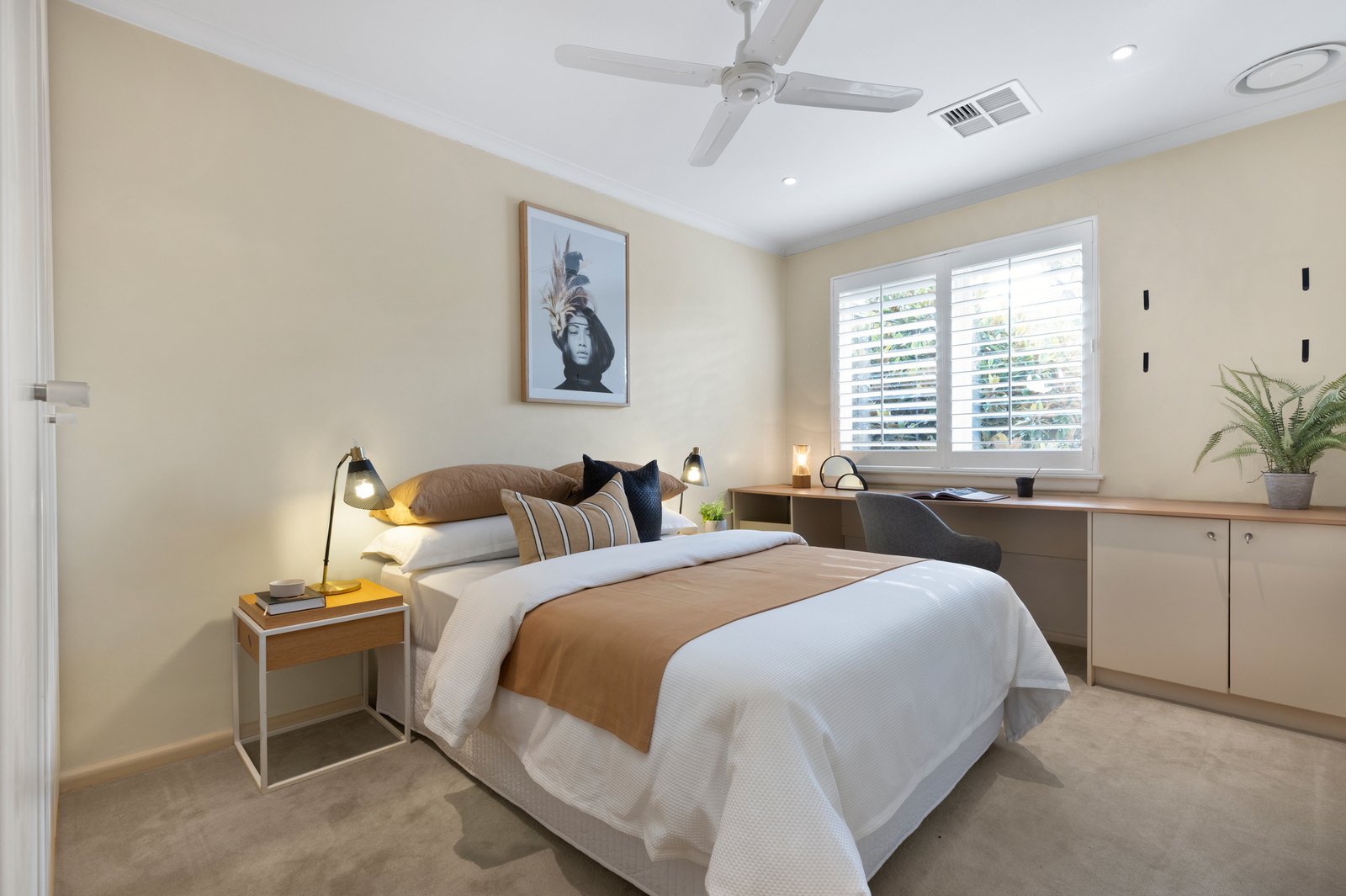 Upstairs, the main bedroom features a walk-in robe, with a second bedroom including a built-in desk and a well-appointed central bathroom. Heating, cooling and an allocated carport add comfort and convenience.